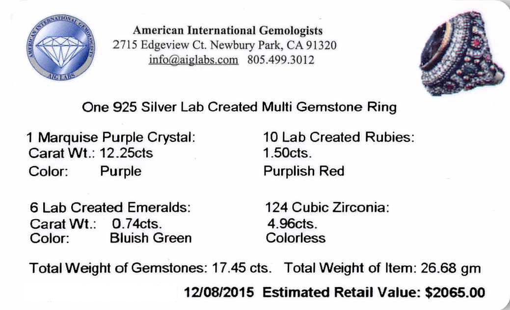 One 12.25ct Purple Crystal and Multi Gemstone Ring - 925 SILVER. The featured lab created purple crystal is set within tiered lab created cubic zirconia bezels supported by tapering lab created ruby, lab created emerald and lab created cubic zirconia set shoulders, completed by a four and one-half millimeter wide band. Bright and anodized finish. Identified with markings of "925". Condition is new, good workmanship. Containing: One bezel set marquise mixed cut laboratory created purple crystal, measuring 19.50 x 9.00 x 5.30mm, approximate weight of 10.25ct., clarity is eye clean, medium dark, very slightly grayish, purple color, (GIA P 6/3), cut is good. Ten bezel set round mixed cut laboratory created rubies, measuring 3.10 - 3.00 x 1.98 mm, approximate total weight of 1.50ct., clarity is eye clean, type II, dark, very slightly brownish, slightly purplish red color, (GIA slpR 7/3), cut is good. Two bezel set oval mixed cut laboratory created emeralds, measuring 5.00 x 3.00 x 1.95mm, approximate total weight of 0.34ct., clarity is eye clean, type III, medium dark, very slightly grayish, very slightly bluish green color, (GIA vslbG 6/3), cut is good. Four bezel set round mixed cut laboratory created emeralds, measuring 3.10 - 3.00 x 1.98 mm, approximate total weight of 0.40ct., clarity is eye clean, type III, medium dark, very slightly grayish, very slightly bluish green color, (GIA vslbG 6/3), cut is good. One hundred twenty-four bead set round brilliant cut laboratory created cubic zirconias, measuring 1.80 - 1.50 x 1.07 mm, approximate total weight of 4.96ct., clarity is eye clean, colorless, very slightly grayish, white color, (GIA W 0/3), cut is good. Total Weight of Colored Stones 17.45ct. Total Weight of Ring 26.68gm. AIG Appraised at $2,065.00.