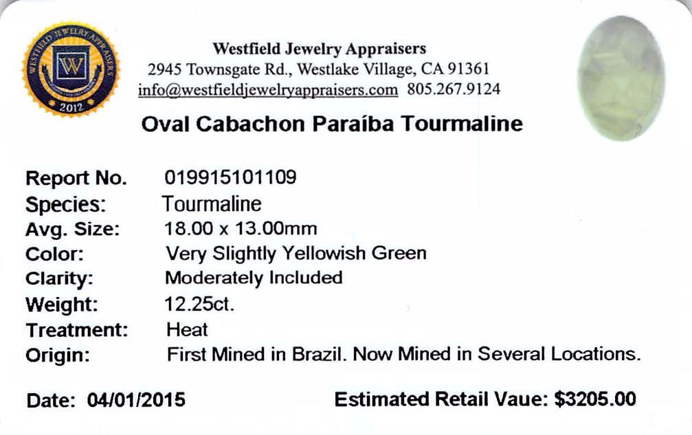 One oval cabochon cut natural Paraiba tourmaline exact weight 12.25ct., clarity is moderately included, cut is good. Westfield Appraised at $3,205.00.