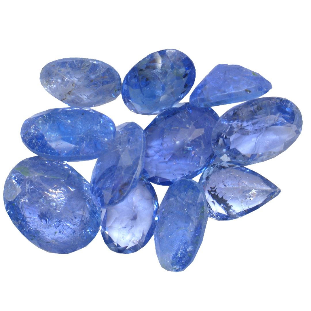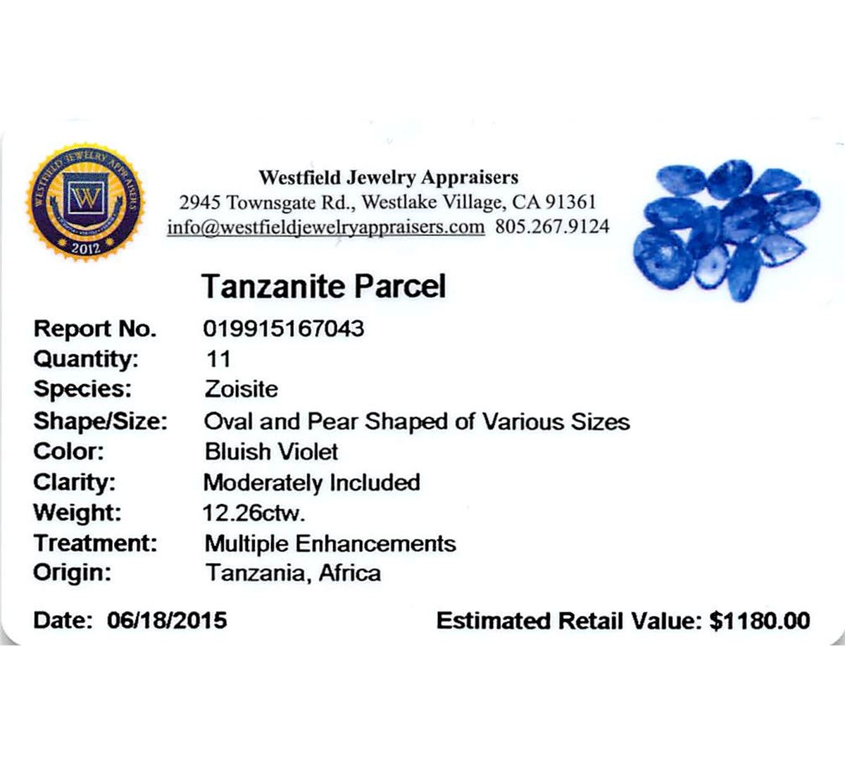 Eleven pear and oval mixed cut natural tanzanites exact total weight 12.26ct., clarity is moderately included, type I, medium dark, very slightly grayish, bluish violet color, (GIA bV 6/3), cut is good. Transmitting light with a minimum of distortion, transparent. Naturally occurring internal & external characteristics are present. Color grade is an average for the group. Tanzanite is a very rare gemstone that is only found in the country of Tanzania. Originally discovered in 1967. Tiffany & Company, named the stone Tanzanite. It is found in the Usumburu Mountains that border the Umba Valley of northern Tanzania. Tanzanite occurs in gray, brown, violet, blue, reddish-purple, & green. The gem is interesting because of its exceptional pleochroism. Rotated in different directions a tanzanite will exhibit multiple changes of color. Tanzanite has a low tolerance to ultrasonic cleaning, and should not be cleaned using this method. Westfield Appraised at $1,180.00.