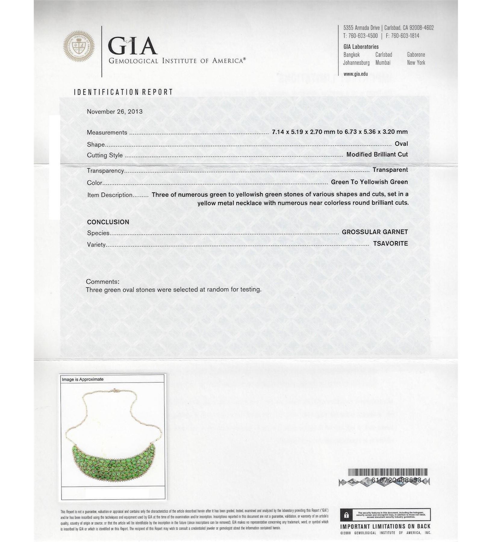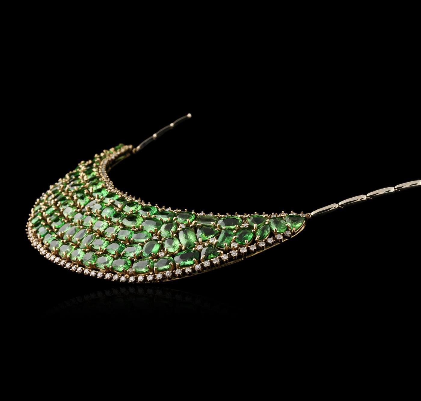 One electronically tested 14KT yellow and white gold lady's combination cast & assembled fashion chest plate necklace with a tongue clasp with foldover safety with a bright polish finish. The featured lady's necklace has a crescent shaped motif and a bar link chain that measures approximately seventeen inches long and 2.50 millimeters wide. Identified with markings of '14K'. Condition is new, good workmanship. Containing: Nine prong set triangle modified brilliant cut natural tsavorite garnets, measuring 7.60 x 6.20 x 4.03mm, (depth est.) approximate total weight of 11.07ct., clarity is slightly included, medium, moderately strong, slightly yellowish green color, (GIA slyG 5/4), cut is good. Transmitting light with a minimum of distortion, transparent. Colored gemstones are presumed to have been subjected to commonly used enhancement processes. Graded in the setting. Sixty-three prong set oval modified brilliant cut natural tsavorite garnets, measuring 7.20 x 5.30 x 3.45mm, (depth est.) approximate total weight of 63.00ct., clarity is slightly included, medium, moderately strong, slightly yellowish green color, (GIA slyG 5/4), cut is good. Transmitting light with a minimum of distortion, transparent. Colored gemstones are presumed to have been subjected to commonly used enhancement processes. Three stones were selected and graded in the GIA Laboratory, Report #6157767366. Nine prong set emerald standard step cut natural tsavorite garnets, measuring 6.75 x 4.20 x 2.73mm, (depth est.) approximate total weight of 6.75ct., clarity is slightly included, medium, moderately strong, slightly yellowish green color, (GIA slyG 5/4), cut is good. Transmitting light with a minimum of distortion, transparent. Colored gemstones are presumed to have been subjected to commonly used enhancement processes. Graded in the setting. Two prong set marquise modified brilliant cut natural tsavorite garnets, measuring 8.20 x 4.50 x 2.93mm, (depth est.) approximate total weight of 1.50ct., clarity is slightly included, medium, moderately strong, slightly yellowish green color, (GIA slyG 5/4), cut is good. Transmitting light with a minimum of distortion, transparent. Colored gemstones are presumed to have been subjected to commonly used enhancement processes. Graded in the setting. One prong set rectangular cushion modified brilliant cut natural tsavorite garnet, measuring 8.50 x 5.08 x 2.78mm, (depth est.) approximate weight of 1.02ct., clarity is slightly included, medium, moderately strong, slightly yellowish green color, (GIA slyG 5/4), cut is good. Transmitting light with a minimum of distortion, transparent. Colored gemstones are presumed to have been subjected to commonly used enhancement processes. Graded in the setting. One prong set round modified brilliant cut natural tsavorite garnet, measuring 6.50 - 6.40 x 4.20 mm, (depth est.) approximate weight of 1.20ct., clarity is slightly included, medium, moderately strong, slightly yellowish green color, (GIA slyG 5/4), cut is good. Transmitting light with a minimum of distortion, transparent. Colored gemstones are presumed to have been subjected to commonly used enhancement processes. Graded in the setting. One Hundred Twenty-Seven prong set round brilliant cut diamonds, measuring 2.10 - 1.80 x 1.21mm (depth est.) approximate total weight of 127 Stones = 4.05ct. Graded in the setting. Color I - J Clarity SI-2 to I-1 Cut Good. Total Weight of Colored Stones 84.54ct.. Total Weight of Diamonds 4.05ct.. Total Weight of Chest Plate Necklace 72.20gm GAS Appraised at $53,705.00.