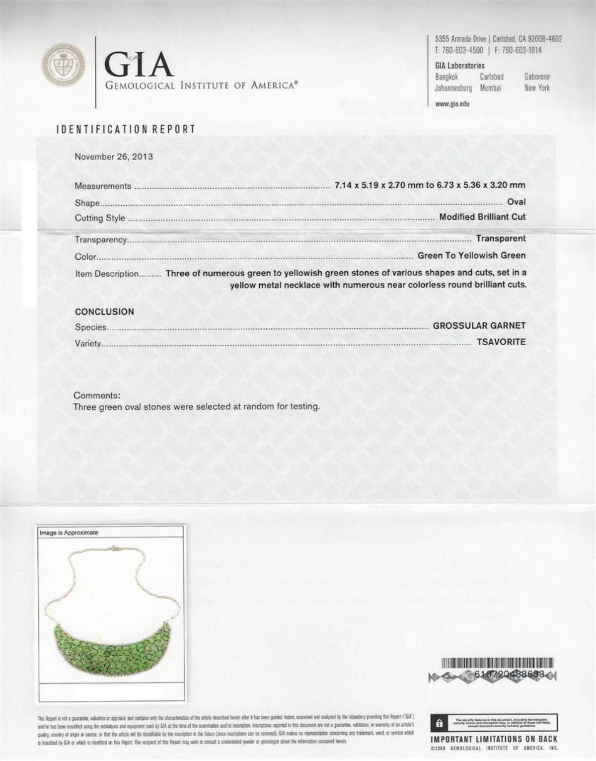 One electronically tested 14KT yellow and white gold lady's combination cast & assembled fashion chest plate necklace with a tongue clasp with foldover safety with a bright polish finish. The featured lady's necklace has a crescent shaped motif and a bar link chain that measures approximately seventeen inches long and 2.50 millimeters wide. Identified with markings of '14K'. Condition is new, good workmanship. Containing: Nine prong set triangle modified brilliant cut natural tsavorite garnets, measuring 7.60 x 6.20 x 4.03mm, (depth est.) approximate total weight of 11.07ct., clarity is slightly included, medium, moderately strong, slightly yellowish green color, (GIA slyG 5/4), cut is good. Transmitting light with a minimum of distortion, transparent. Colored gemstones are presumed to have been subjected to commonly used enhancement processes. Graded in the setting. Sixty-three prong set oval modified brilliant cut natural tsavorite garnets, measuring 7.20 x 5.30 x 3.45mm, (depth est.) approximate total weight of 63.00ct., clarity is slightly included, medium, moderately strong, slightly yellowish green color, (GIA slyG 5/4), cut is good. Transmitting light with a minimum of distortion, transparent. Colored gemstones are presumed to have been subjected to commonly used enhancement processes. Three stones were selected and graded in the GIA Laboratory, Report #6157767366. Nine prong set emerald standard step cut natural tsavorite garnets, measuring 6.75 x 4.20 x 2.73mm, (depth est.) approximate total weight of 6.75ct., clarity is slightly included, medium, moderately strong, slightly yellowish green color, (GIA slyG 5/4), cut is good. Transmitting light with a minimum of distortion, transparent. Colored gemstones are presumed to have been subjected to commonly used enhancement processes. Graded in the setting. Two prong set marquise modified brilliant cut natural tsavorite garnets, measuring 8.20 x 4.50 x 2.93mm, (depth est.) approximate total weight of 1.50ct., clarity is slightly included, medium, moderately strong, slightly yellowish green color, (GIA slyG 5/4), cut is good. Transmitting light with a minimum of distortion, transparent. Colored gemstones are presumed to have been subjected to commonly used enhancement processes. Graded in the setting. One prong set rectangular cushion modified brilliant cut natural tsavorite garnet, measuring 8.50 x 5.08 x 2.78mm, (depth est.) approximate weight of 1.02ct., clarity is slightly included, medium, moderately strong, slightly yellowish green color, (GIA slyG 5/4), cut is good. Transmitting light with a minimum of distortion, transparent. Colored gemstones are presumed to have been subjected to commonly used enhancement processes. Graded in the setting. One prong set round modified brilliant cut natural tsavorite garnet, measuring 6.50 - 6.40 x 4.20 mm, (depth est.) approximate weight of 1.20ct., clarity is slightly included, medium, moderately strong, slightly yellowish green color, (GIA slyG 5/4), cut is good. Transmitting light with a minimum of distortion, transparent. Colored gemstones are presumed to have been subjected to commonly used enhancement processes. Graded in the setting. One Hundred Twenty-Seven prong set round brilliant cut diamonds, measuring 2.10 - 1.80 x 1.21mm (depth est.) approximate total weight of 127 Stones = 4.05ct. Graded in the setting. Color I - J Clarity SI-2 to I-1 Cut Good. Total Weight of Colored Stones 84.54ct.. Total Weight of Diamonds 4.05ct.. Total Weight of Chest Plate Necklace 72.20gm GAS Appraised.