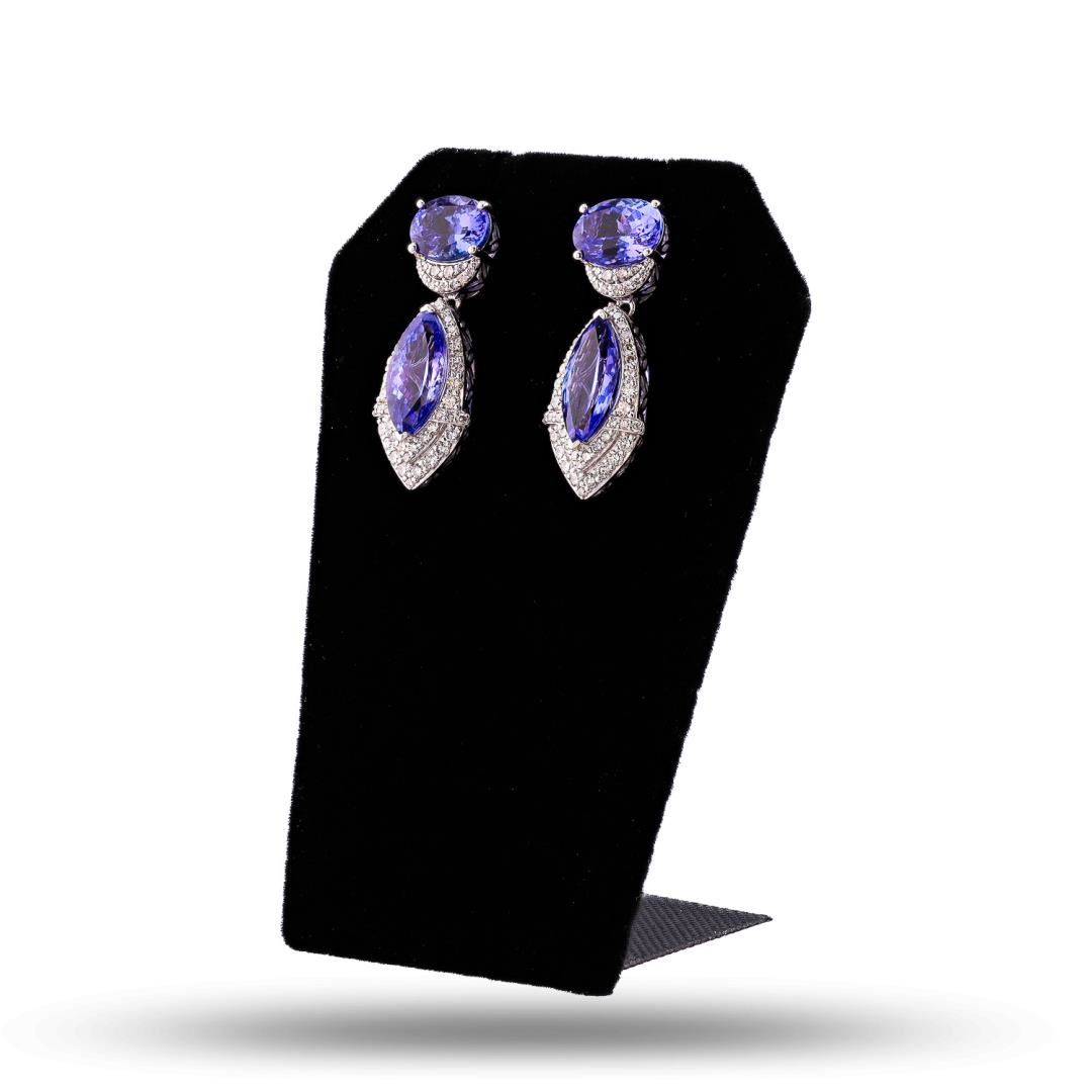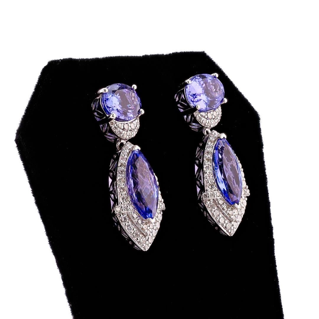 Platinum (PLAT) natural tanzanite zoisite and diamond earrings. Oval and marquise brilliant cut natural tanzanite zoisite gemstones are mounted in the center of the earrings. Round brilliant cut diamonds accent the earrings around the center gemstones. The earrings have a gross weight of 12.9 Grams. #NATURAL GEMSTONE# GEMSTONE: Tanzanite Zoisite NATURE: Natural SHAPE: Oval/Marquise Brilliant, Faceted WEIGHT: 12.28 carat total (4pcs.) DIMENSIONS: 10.0-7.7 / 14.4-6.9mm CLARITY: Type 1 COLOR: Bluish Violet (5/5) SYMMETRY: Excellent COLOR INTENSITY: Intense TRANSPARENCY: Transparent TONE: Dark #NATURAL DIAMOND# SHAPE: Round Brilliant Cut WEIGHT: 1.43 carat total (104pcs.) DIMENSIONS: 2.2 x 1.0mm AVERAGE CLARITY: VS1-VS2 AVERAGE COLOR: F-G SYMMETRY: Excellent POLISH: Excellent #METAL# METAL: Platinum PURITY: 950 COLOR: White CONDITION: Excellent FINISH: High Polish