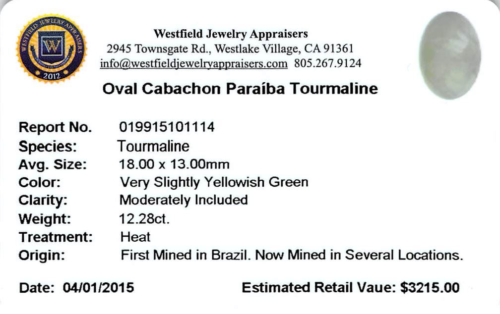 One oval cabochon cut natural Paraiba tourmaline exact weight 12.28ct., clarity is moderately included, cut is good. Westfield Appraised at $3,215.00.