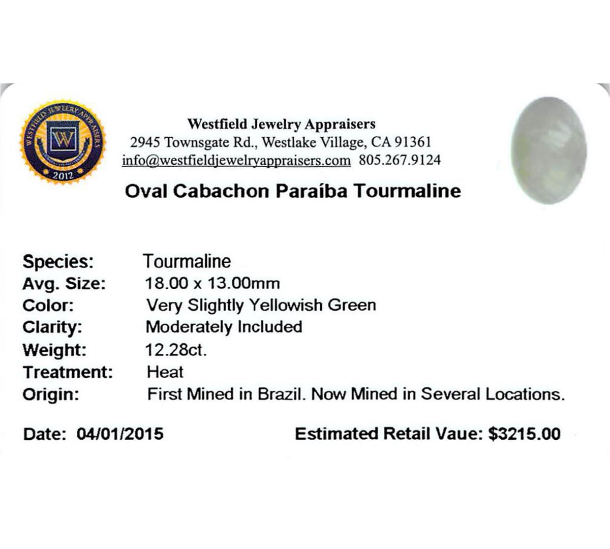 One oval cabochon cut natural Paraiba tourmaline exact weight 12.28ct., clarity is moderately included, cut is good. Westfield Appraised at $3,215.00.