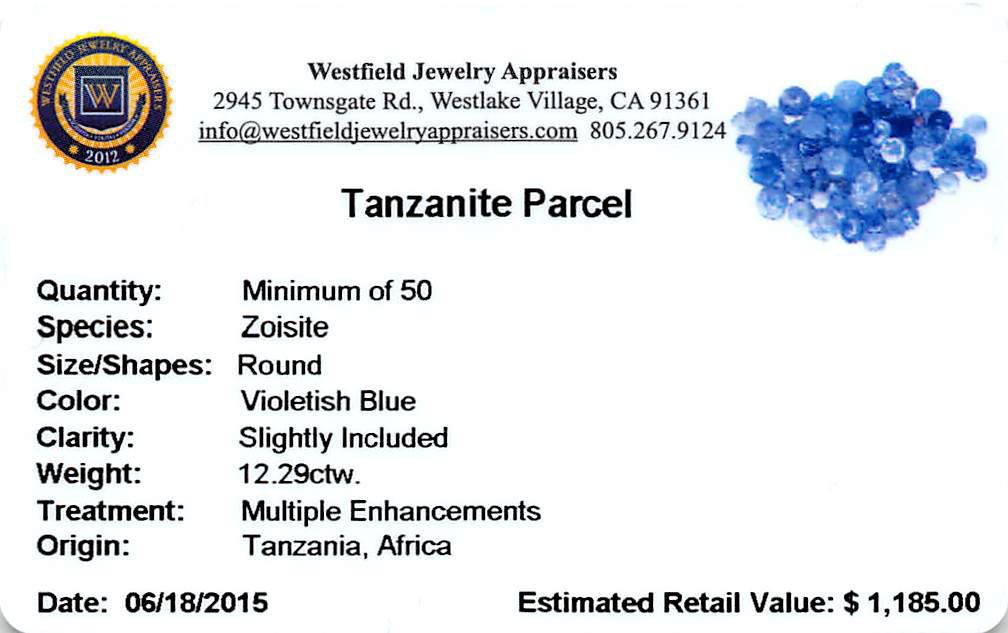 Fifty round mixed cut natural tanzanites exact total weight 12.29ct., clarity is slightly included, type I, medium dark, slightly grayish, violetish blue color, (GIA vB 6/2), cut is good. Measurements & the color grade are an average for the group, Color grade is an average for the group, Naturally occurring internal & external characteristics are present, Indications of laboratory high temperature heat treatment. Westfield Appraised at $1,185.00.