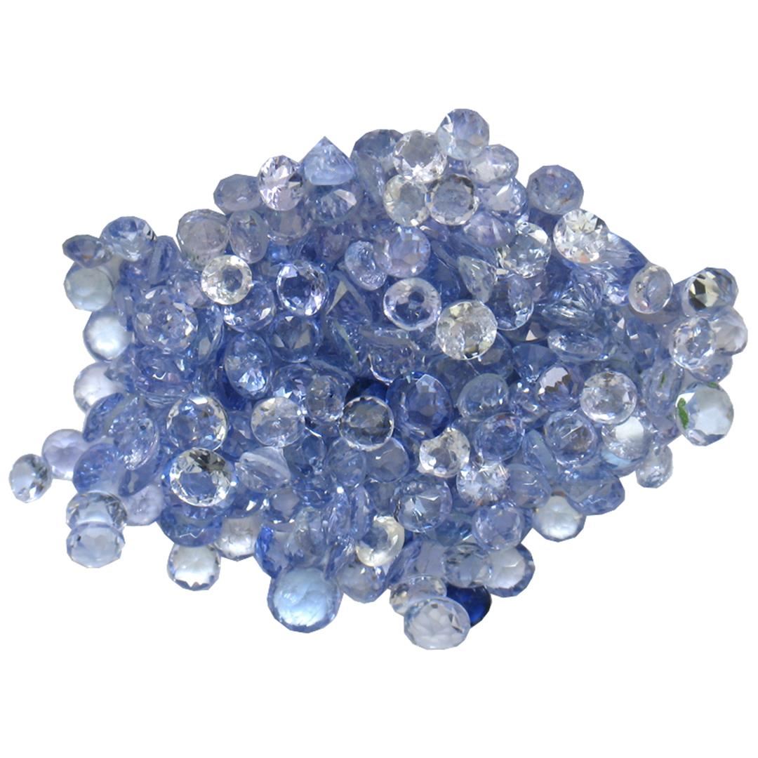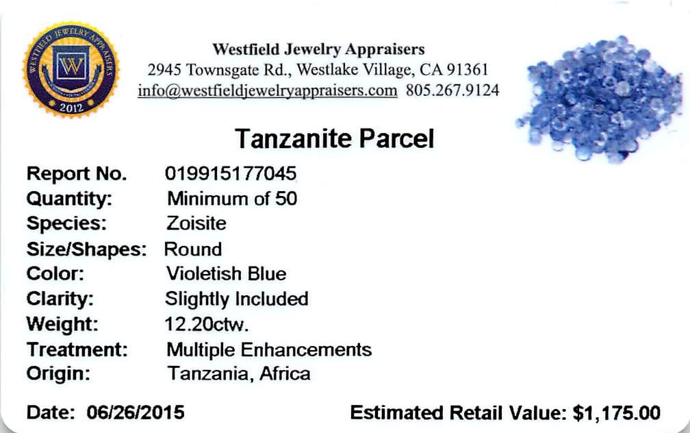 Fifty round mixed cut natural tanzanites, measuring 2.00 - 2.00 x 1.30 mm, exact total weight 12.20ct., clarity is slightly included, type I, medium, very slightly grayish, violetish blue color, (GIA vB 5/3), cut is good. Measurements & the color grade are an average for the group, Color grade is an average for the group, Transmitting light with no distortion, transparent, Naturally occurring internal & external characteristics are present, Indications of multiple laboratory enhancements, including high temperature heat treatment. Westfield Appraised at $1,175.00.