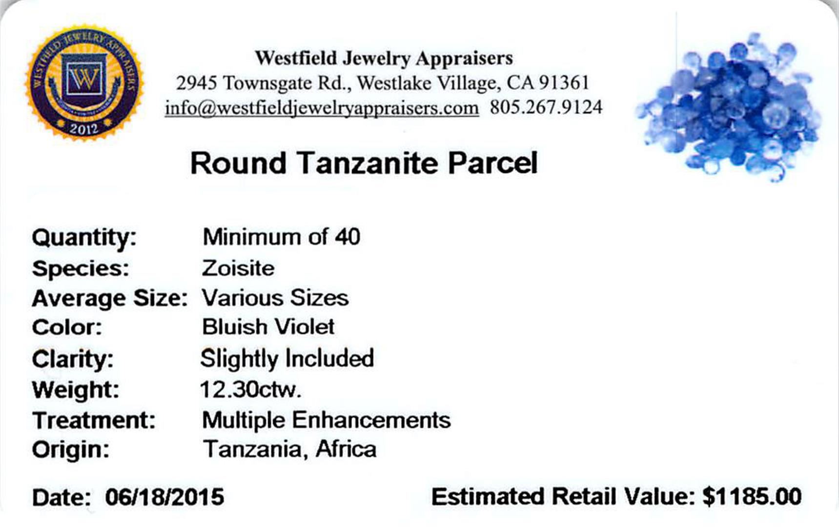 Forty round mixed cut natural tanzanites exact total weight 12.30ct., clarity is slightly included, type I, medium dark, very slightly grayish, bluish violet color, (GIA bV 6/3), cut is good. Transmitting light with a minimum of distortion, transparent. Naturally occurring internal & external characteristics are present. Color grade is an average for the group. Tanzanite is a very rare gemstone that is only found in the country of Tanzania. Originally discovered in 1967. Tiffany & Company, named the stone Tanzanite. It is found in the Usumburu Mountains that border the Umba Valley of northern Tanzania. Tanzanite occurs in gray, brown, violet, blue, reddish-purple, & green. The gem is interesting because of its exceptional pleochroism. Rotated in different directions a tanzanite will exhibit multiple changes of color. Tanzanite has a low tolerance to ultrasonic cleaning, and should not be cleaned using this method. Westfield Appraised at $1,185.00.