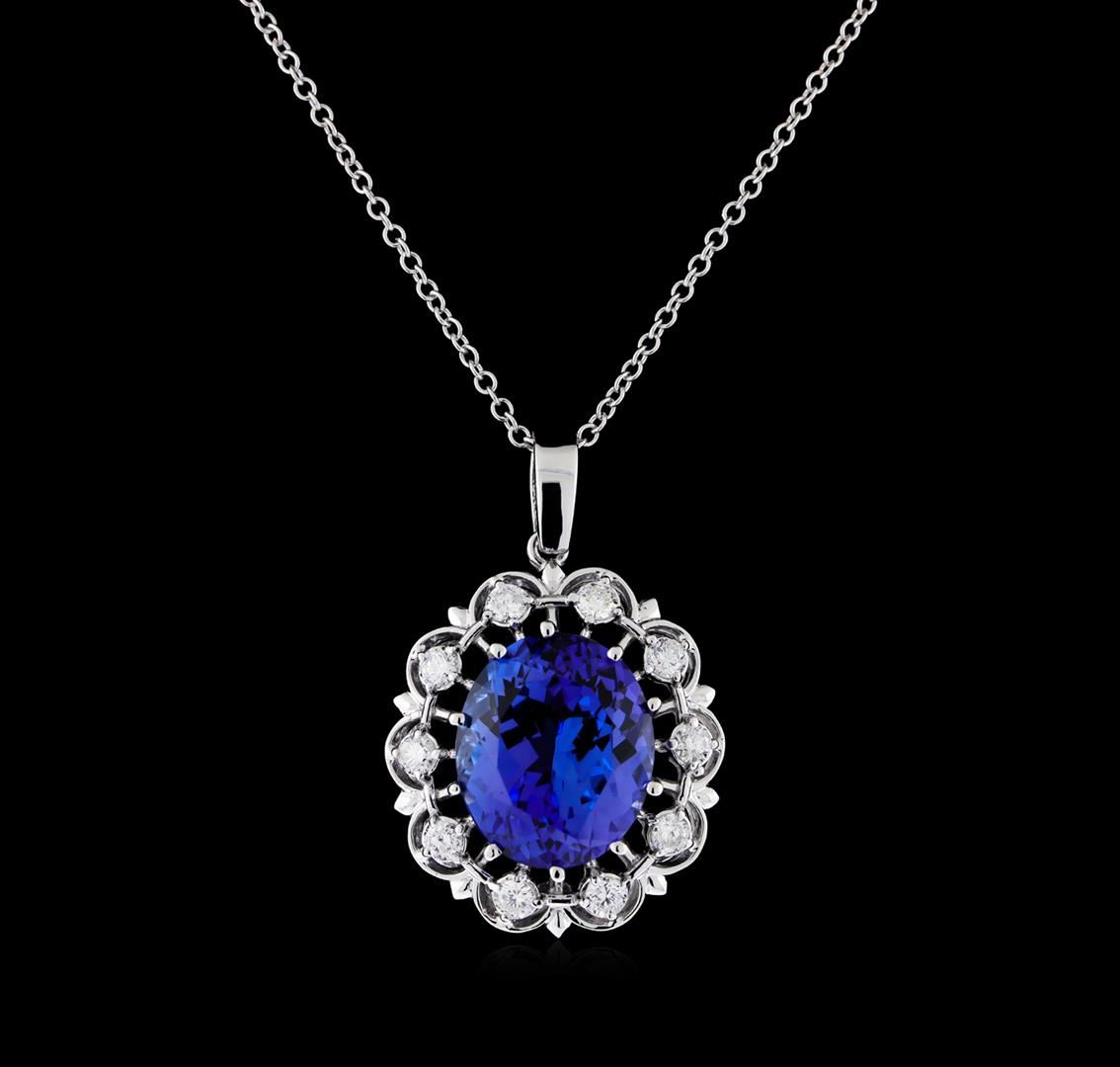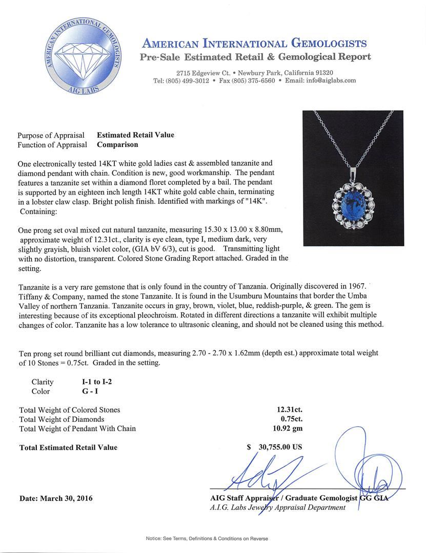 One electronically tested 14KT white gold ladies cast & assembled tanzanite and diamond pendant with chain. The pendant features a tanzanite set within a diamond floret completed by a bail. The pendant is supported by an eighteen inch length 14KT white gold cable chain, terminating in a lobster claw clasp. Bright polish finish. Identified with markings of "14K". Condition is new, good workmanship. Containing: One prong set oval mixed cut natural tanzanite, measuring 15.30 x 13.00 x 8.80mm, approximate weight of 12.31ct., clarity is eye clean, type I, medium dark, very slightly grayish, bluish violet color, (GIA bV 6/3), cut is good. Transmitting light with no distortion, transparent. Colored Stone Grading Report attached. Graded in the setting. Tanzanite is a very rare gemstone that is only found in the country of Tanzania. Originally discovered in 1967. Tiffany & Company, named the stone Tanzanite. It is found in the Usumburu Mountains that border the Umba Valley of northern Tanzania. Tanzanite occurs in gray, brown, violet, blue, reddish-purple, & green. The gem is interesting because of its exceptional pleochroism. Rotated in different directions a tanzanite will exhibit multiple changes of color. Tanzanite has a low tolerance to ultrasonic cleaning, and should not be cleaned using this method. Ten prong set round brilliant cut diamonds, measuring 2.70 - 2.70 x 1.62mm (depth est.) approximate. Total Weight of 10 Stones = 0.75ct. Graded in the setting. Clarity: I-1 to I-2. Color: G - I. Total Weight of Colored Stones 12.31ct. Total Weight of Diamonds 0.75ct. Total Weight of Pendant With Chain 10.92gm. AIG Appraised at $30,755.00.