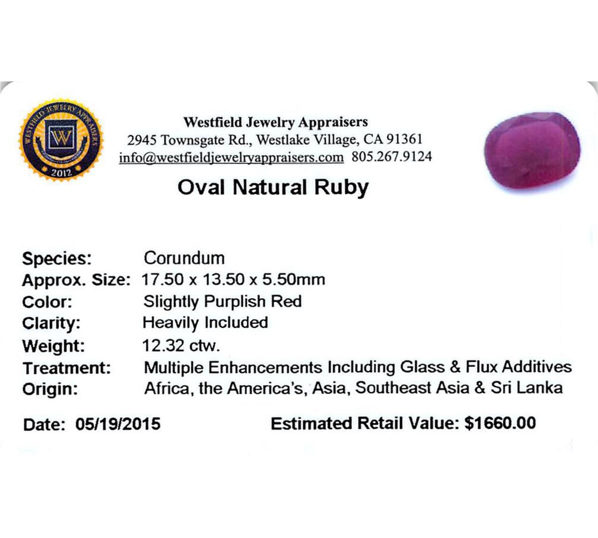 One oval mixed cut natural ruby, measuring 17.50 x 13.50 x 5.50mm, exact weight 12.32ct., clarity is heavily included, type II, medium dark, very slightly brownish, slightly purplish red color, (GIA slpR 6/3), cut is good. Transmitting light somewhat diffusely, transparent to translucent. Naturally occurring internal & external characteristics are present. Indications of laboratory high temperature heat treatment, with glass & flux additives. Ruby has a low tolerance to rhodium plating, repolishing the surface, & ultrasonic cleaning. Westfield Appraised at $1,660.00.