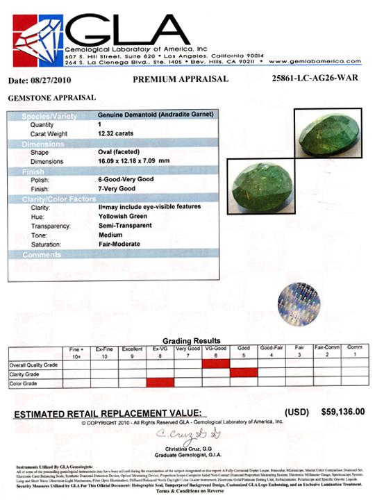 Excellent yellow green colored specimen oval cut; lab quality evaluation 7; treatment as noted; Gem Guide wholesale $11088-$15400; full retail appraisal $59136; full lab evaluation included