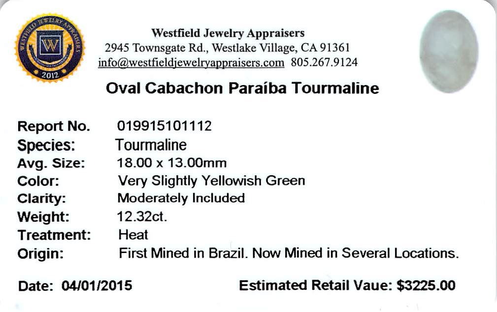 One oval cabochon cut natural Paraiba tourmaline exact weight 12.32ct., clarity is moderately included, cut is good. Westfield Appraised at $3,225.00.