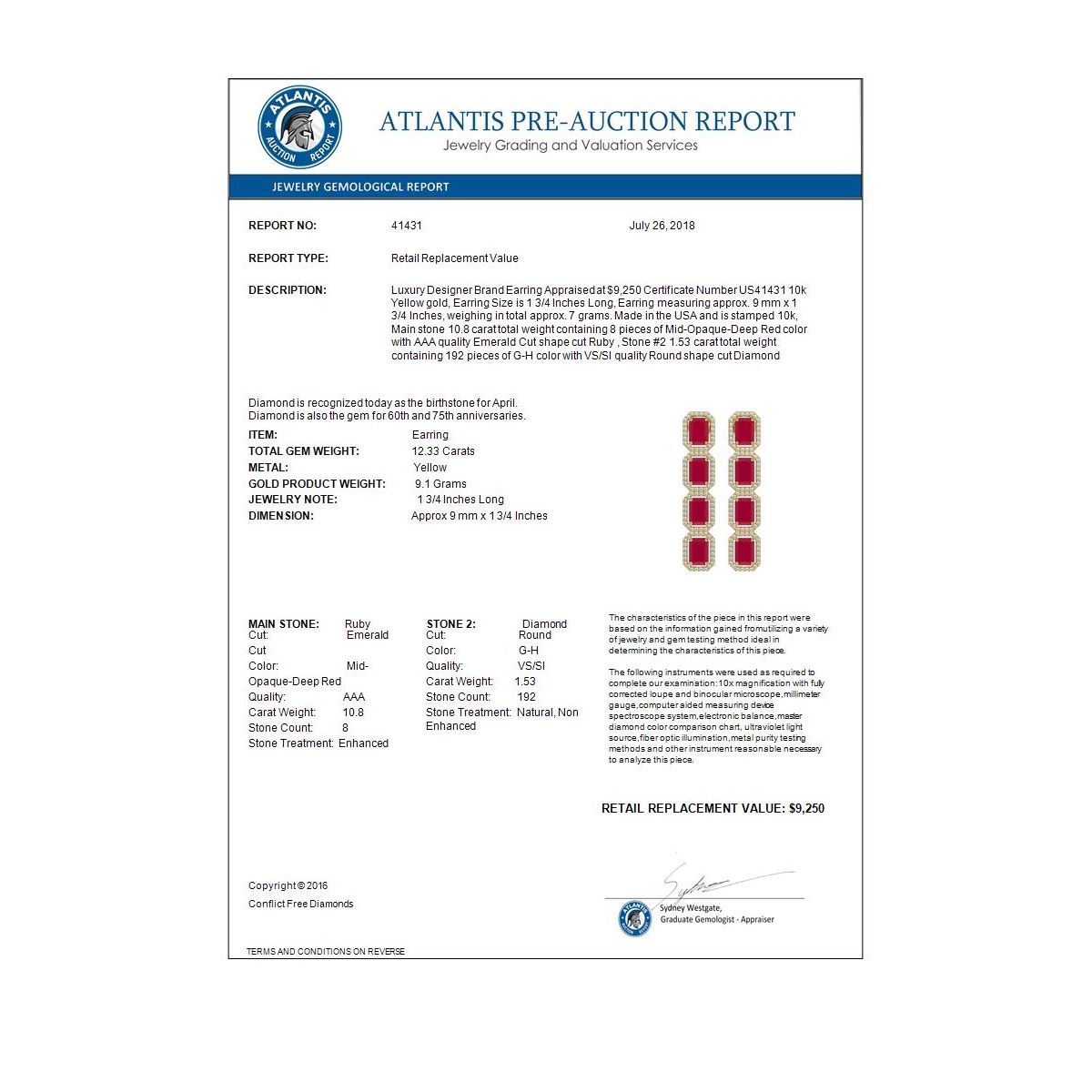 REF-168N2Y -41431 ---- 12.33 CTW Ruby & Diamond Halo Earrings 10K Yellow Gold ---- Luxury Designer Brand Earring Appraised at $9,250 Certificate Number US41431 10k Yellow gold, Earring Size is 1 3/4 Inches Long, Earring measuring approx. 9 mm x 1 3/4 Inches, weighing in total approx. 7 grams. Made in the USA and is stamped 10k, Main stone 10.8 carat total weight containing 8 pieces of Mid-Opaque-Deep Red color with AAA quality Emerald Cut shape cut Ruby , Stone #2 1.53 carat total weight containing 192 pieces of G-H color with VS/SI quality Round shape cut Diamond