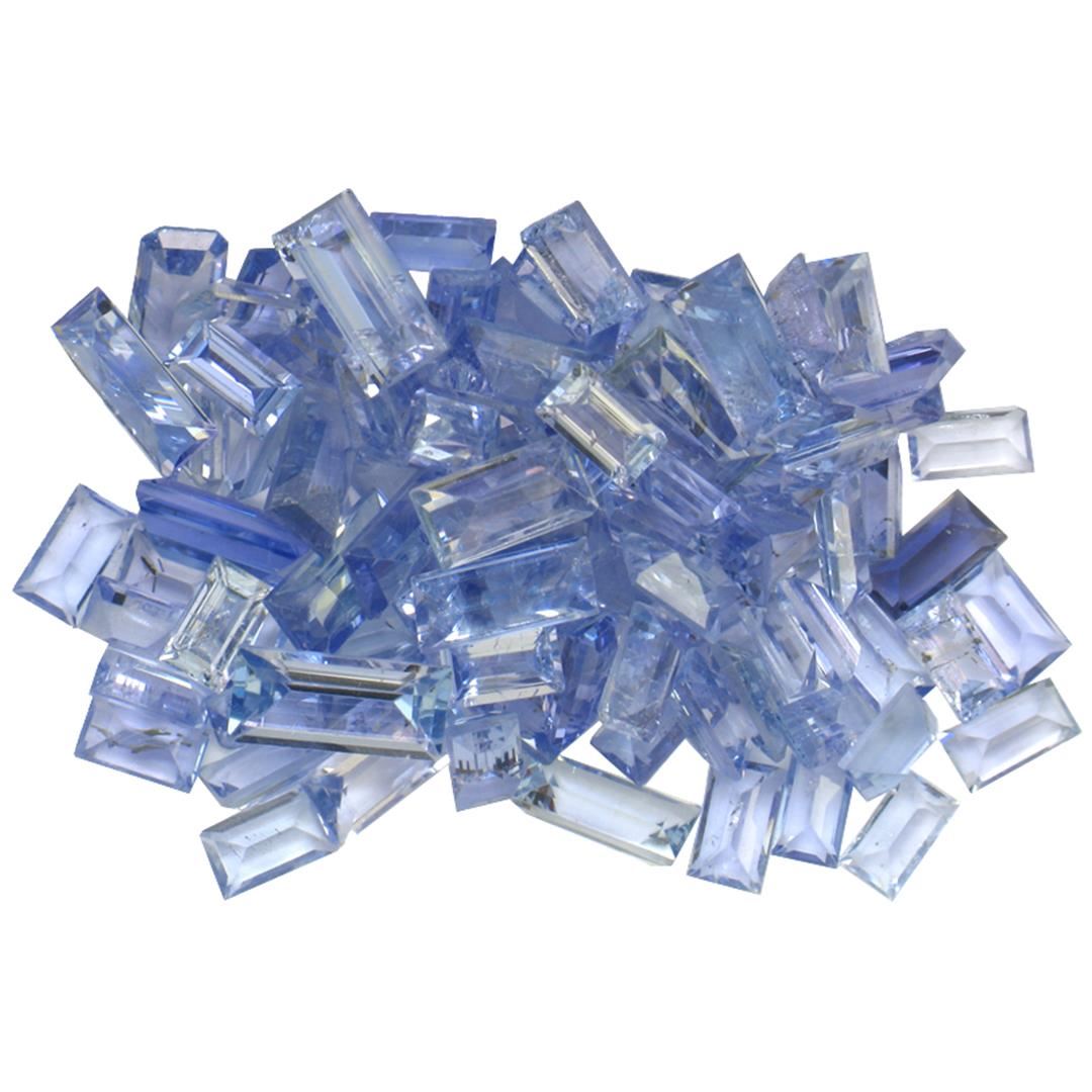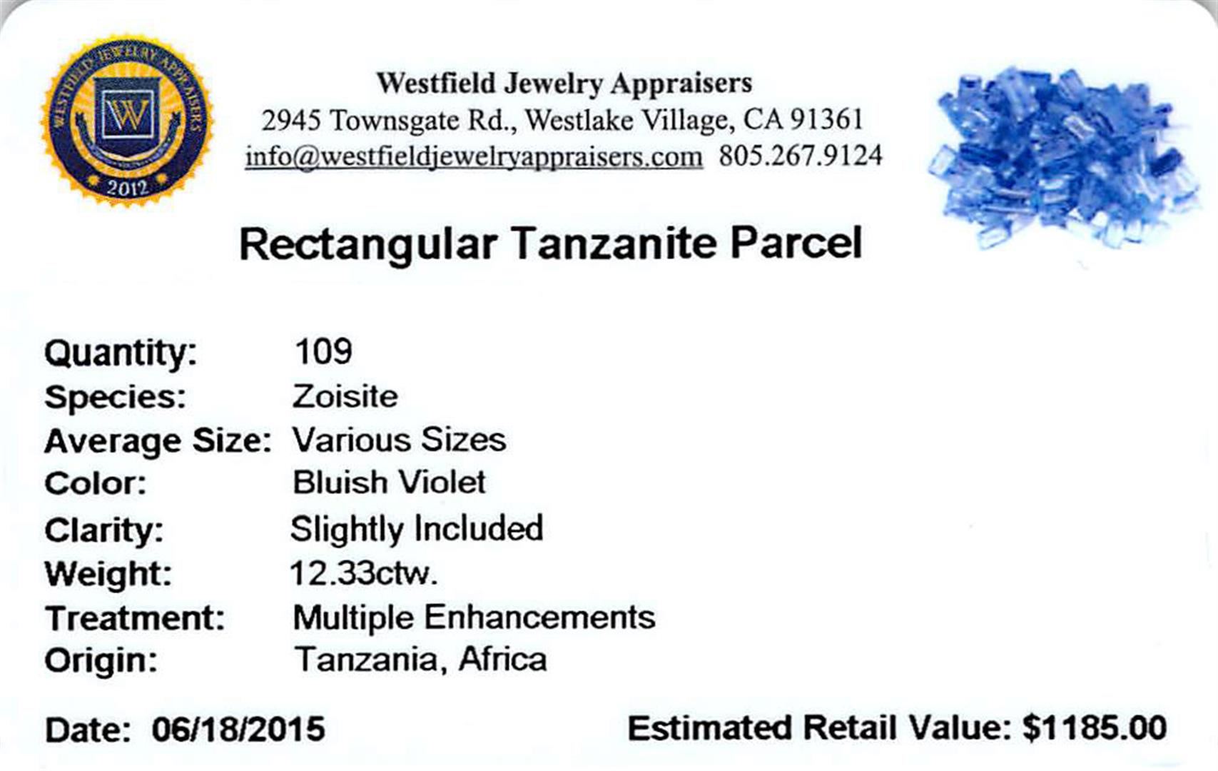One hundred nine rectangular step cut natural tanzanites exact total weight 12.33ct., clarity is slightly included, type I, medium dark, very slightly grayish, bluish violet color, (GIA bV 6/3), cut is good. Transmitting light with a minimum of distortion, transparent. Naturally occurring internal & external characteristics are present. Color grade is an average for the group. Tanzanite is a very rare gemstone that is only found in the country of Tanzania. Originally discovered in 1967. Tiffany & Company, named the stone Tanzanite. It is found in the Usumburu Mountains that border the Umba Valley of northern Tanzania. Tanzanite occurs in gray, brown, violet, blue, reddish-purple, & green. The gem is interesting because of its exceptional pleochroism. Rotated in different directions a tanzanite will exhibit multiple changes of color. Tanzanite has a low tolerance to ultrasonic cleaning, and should not be cleaned using this method. Westfield Appraised at $1,185.00.