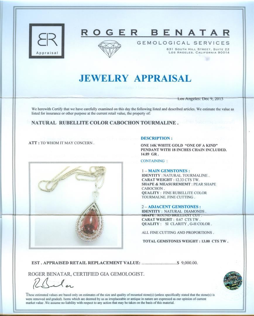 One 14KT White Gold "One of a Kind" Pendant with 18 inches chain included, 14.89 grams. Containing: Main Gemstones: Identity: Natural Tourmaline. Carat Weight: 12.33 cts tw. Shape & Measurement: Pear Shape Cabochon. Quality: Fine Rubellite Color Tourmaline. Fine Cutting. Adjacent Gemstones: Identity: Natural Diamonds. Shape: Round Brilliant Cut. Carat Weight: 0.67 cts tw. Quality: SI Clarity, G-H Color. All fine cutting and proportions. Total Gemstones Weight: 13.00 cts tw. RBGS Appraised.