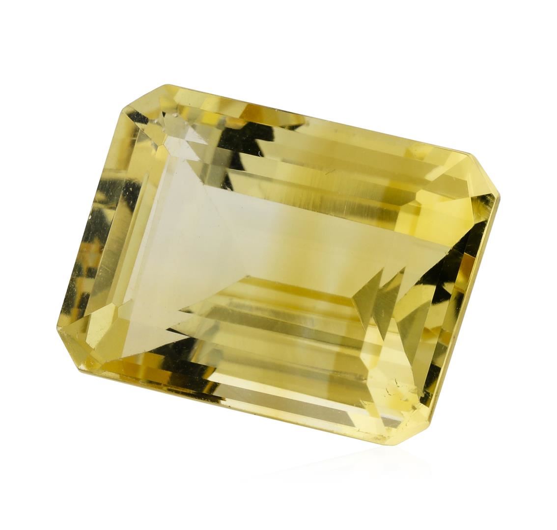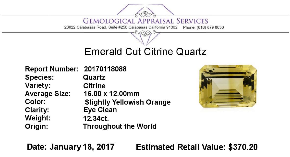 One natural emerald cut citrine quartz with an exact weight of 12.34ct., clarity is eye clean, slightly yellowish orange. Gemological Appraisals Services estimates the retail value at $370.2 GAS Appraised.