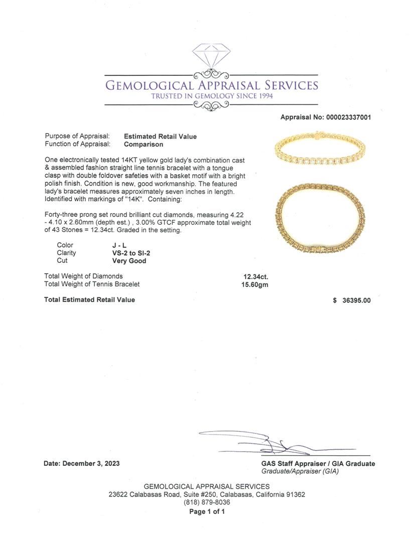 One new 12.34 ctw Diamond Tennis Bracelet - 14KT Yellow Gold. Appraisal Value: $36395. See appraisal for full details.