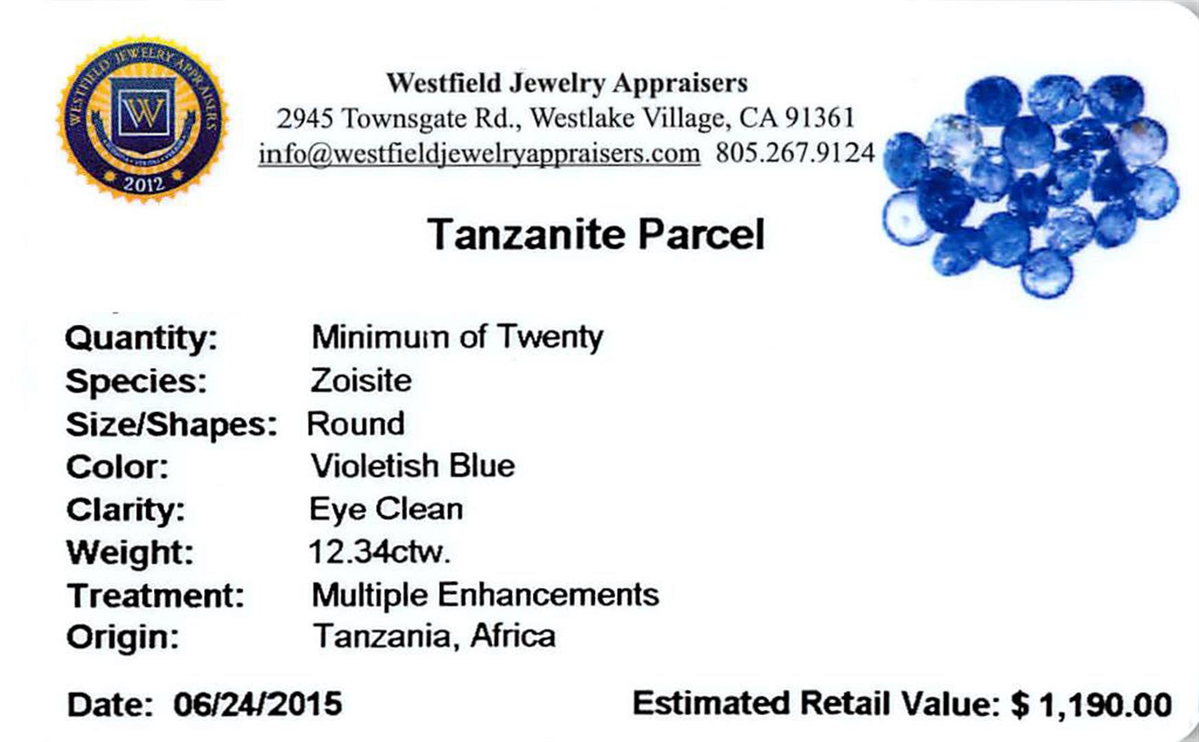 Twenty round mixed cut natural tanzanites, measuring 5.00 - 5.00 x 3.00 mm, exact total weight 12.34ct., clarity is slightly included, type I, medium dark, very slightly grayish, violetish blue color, (GIA vB 6/3), cut is good. Measurements & the color grade are an average for the group, Color grade is an average for the group, Transmitting light with no distortion, transparent, Naturally occurring internal & external characteristics are present, Indications of multiple laboratory enhancements, including high temperature heat treatment. Westfield Appraised at $1,190.00.