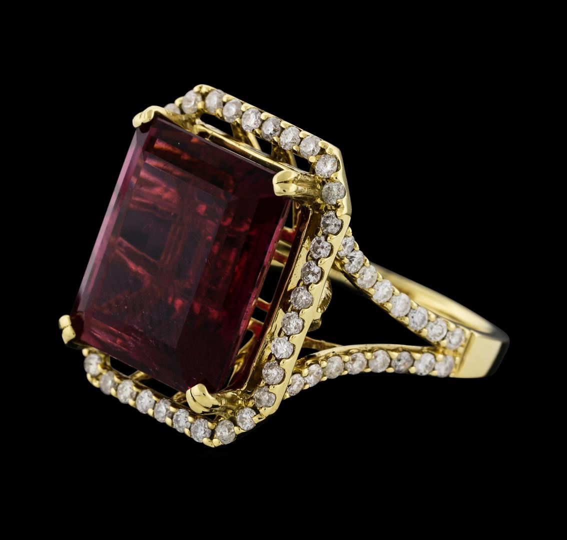 One electronically tested 14KT yellow gold lady's cast fashion ring with a split shank basket halo with a bright polish finish. The featured lady's ring has a shank measuring 1.93 millimeters wide. Identified with markings of '14K'. Condition is new, good workmanship. Containing: One prong set emerald standard step cut natural rubellite, measuring 14.27 x 12.33 x 8.00mm, (depth est.) approximate weight of 12.34ct., clarity is slightly included, medium dark, strong, strongly purplish red color, (GIA stpR 6/5), cut is very good. Transmitting light with a minimum of distortion, transparent. Colored gemstones are presumed to have been subjected to commonly used enhancement processes. Graded in the setting. Sixty-Eight prong set round brilliant cut diamonds, measuring 1.60 - 1.45 x 0.93mm (depth est.) approximate total weight of 68 Stones = 0.90ct. Graded in the setting. Clarity SI-1 to SI-2. Color: H - I Cut Good. Total Weight of Colored Stones 12.34ct.. Total Weight of Diamonds 0.90ct.. Total Weight of Ring 7.70gm. GAS Appraised at $13,975.00.