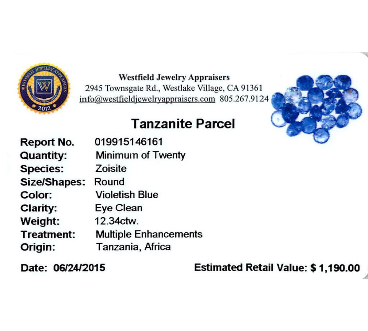 Twenty round mixed cut natural tanzanites, measuring 5.00 - 5.00 x 3.00 mm, exact total weight 12.34ct., clarity is slightly included, type I, medium dark, very slightly grayish, violetish blue color, (GIA vB 6/3), cut is good. Measurements & the color grade are an average for the group, Color grade is an average for the group, Transmitting light with no distortion, transparent, Naturally occurring internal & external characteristics are present, Indications of multiple laboratory enhancements, including high temperature heat treatment. Westfield Appraised at $1,190.00.