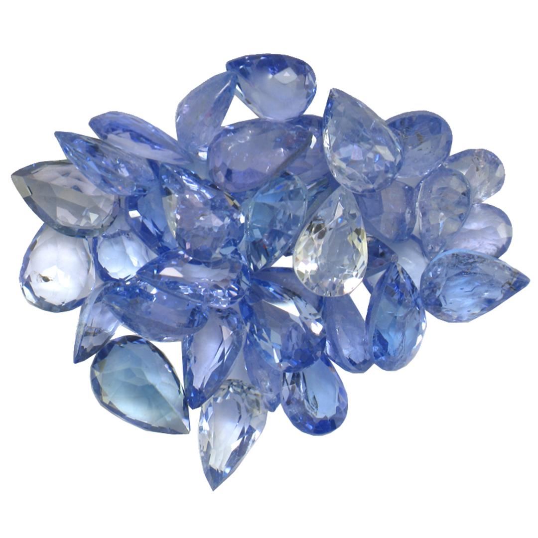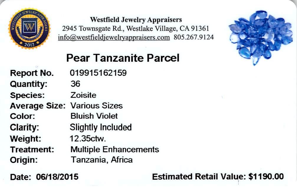 Thirty-six pear mixed cut natural tanzanites exact total weight 12.35ct., clarity is slightly included, type I, medium dark, very slightly grayish, bluish violet color, (GIA bV 6/3), cut is good. Transmitting light with a minimum of distortion, transparent. Naturally occurring internal & external characteristics are present. Color grade is an average for the group. Tanzanite is a very rare gemstone that is only found in the country of Tanzania. Originally discovered in 1967. Tiffany & Company, named the stone Tanzanite. It is found in the Usumburu Mountains that border the Umba Valley of northern Tanzania. Tanzanite occurs in gray, brown, violet, blue, reddish-purple, & green. The gem is interesting because of its exceptional pleochroism. Rotated in different directions a tanzanite will exhibit multiple changes of color. Tanzanite has a low tolerance to ultrasonic cleaning, and should not be cleaned using this method. Westfield Appraised at $1,190.00.