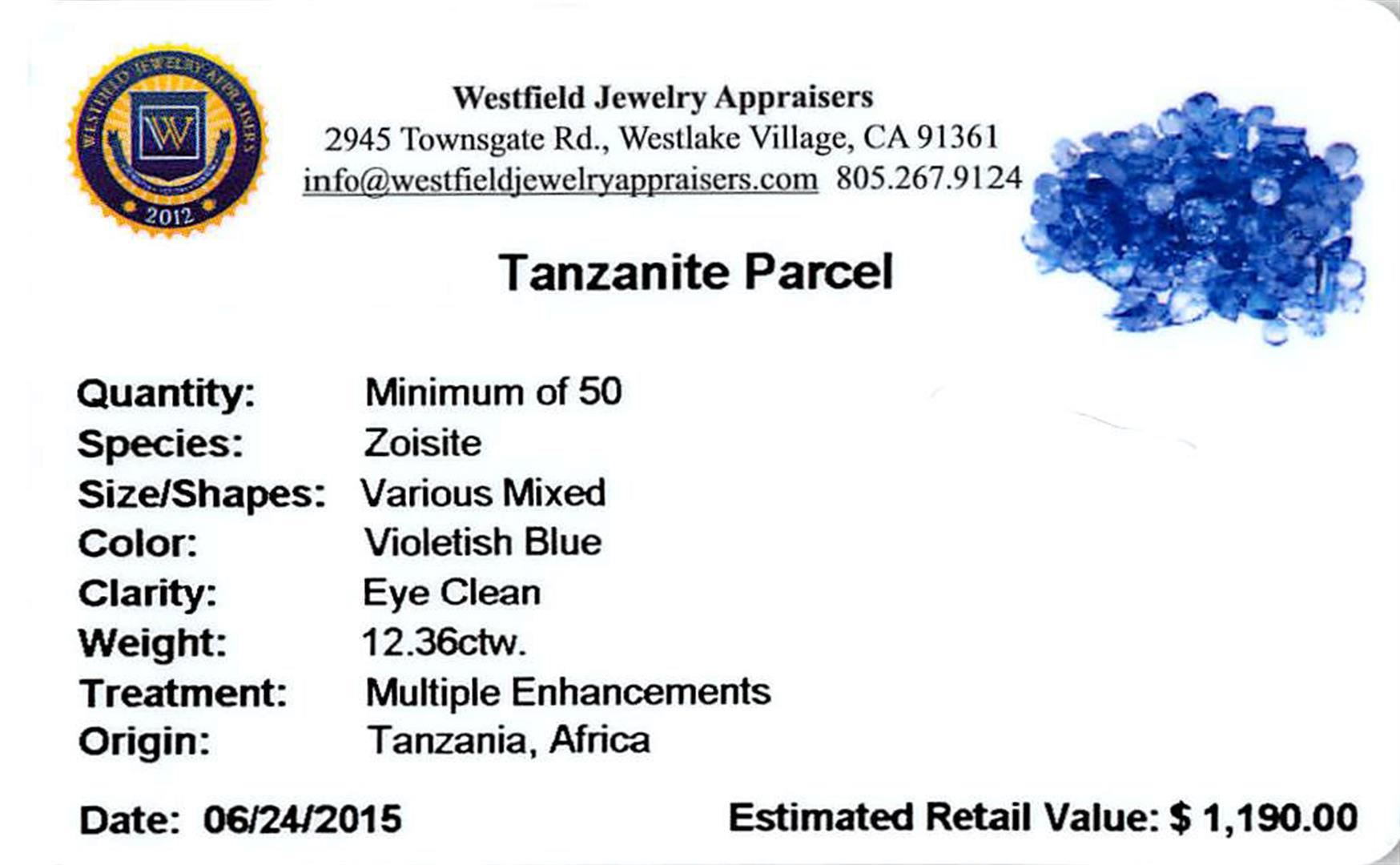 Fifty mixed cut natural tanzanites exact total weight 12.36ct., clarity is slightly included, type I, medium dark, very slightly grayish, violetish blue color, (GIA vB 6/3), cut is good. Measurements & the color grade are an average for the group, Color grade is an average for the group, Transmitting light with no distortion, transparent, Naturally occurring internal & external characteristics are present, Indications of multiple laboratory enhancements, including high temperature heat treatment. Westfield Appraised at $1,190.00.