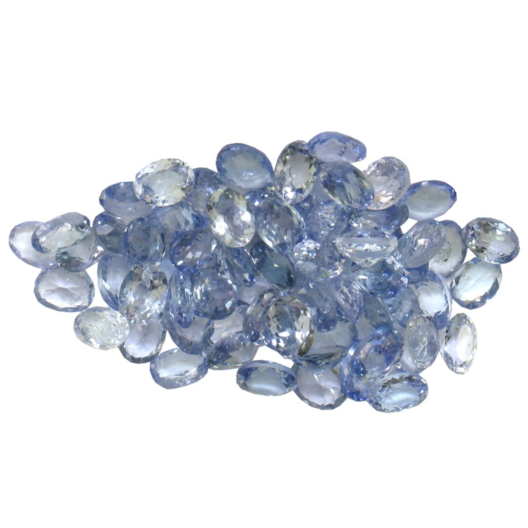 Forty oval mixed cut natural tanzanites exact total weight 12.36ct., clarity is slightly included, type I, medium dark, very slightly grayish, violetish blue color, (GIA vB 6/3), cut is good. Measurements & the color grade are an average for the group, Color grade is an average for the group, Transmitting light with no distortion, transparent, Indications of laboratory high temperature heat treatment. Westfield Appraised at $1,190.00.