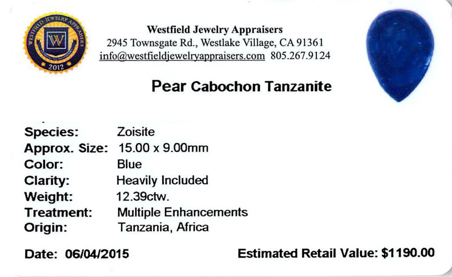 One pear cabochon cut natural tanzanite, measuring 16.00 x 11.00 x 8.00mm, exact weight 12.39ct., clarity is heavily included, type I, dark, moderately strong, blue color, (GIA B 7/4), cut is good. Transmitting light somewhat diffusely, transparent to translucent. Naturally occurring internal & external characteristics are present. Indications of heat treatment. Westfield Appraised at $1,190.00.