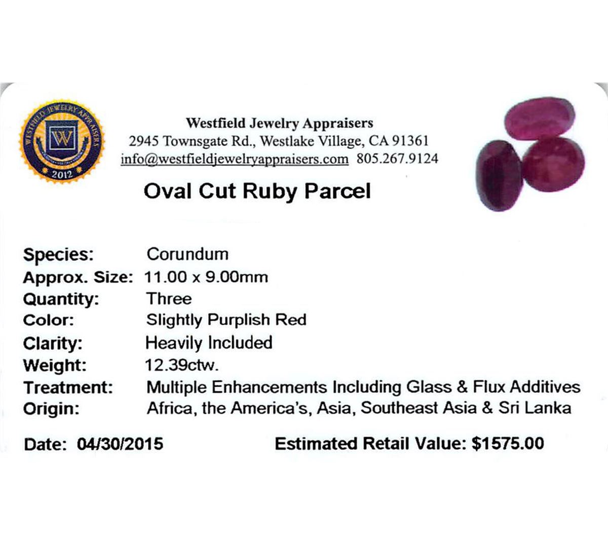 Three oval mixed cut natural rubies exact total weight 12.39ct., clarity is heavily included, type II, dark, very slightly brownish, slightly purplish red color, (GIA slpR 7/3), cut is good. Westfield Appraised at $1,575.00.