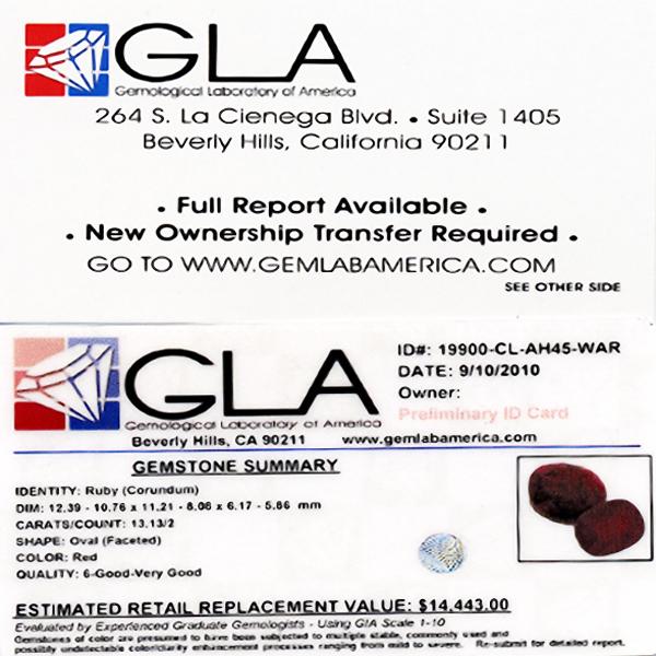 In the event that an item is listed as having an "Appraisal Estimate", this represents WAR's in-house estimate of what the item would appraise for at Gem Labs of America (GLA), Beverly Hills, CA. Actual appraisal of the item at GLA is the responsibility of the Bidder, however WAR may assist, at its discretion, in related logistics. WAR does provide the following guaranty (the "WAR 5% Loose Gem Guaranty") relative to Appraisal Estimate values of LOOSE GEMS: In the event that the GLA appraised value is not such an amount that the Bidder's winning bid is five percent (5%) or less of the GLA appraised value, then WAR, in it's discretion, will either refund such amount of the Bidder's winning bid and related charges so that the winning bid equals five percent (5%) of the GLA appraised value, or, instead issue a full refund on the item and reimburse the Bidder for the GLA appraisal fees. The Bidder may also opt to retain the item, in which case the WAR 5% Gem Guaranty shall not apply relative to the particular item.