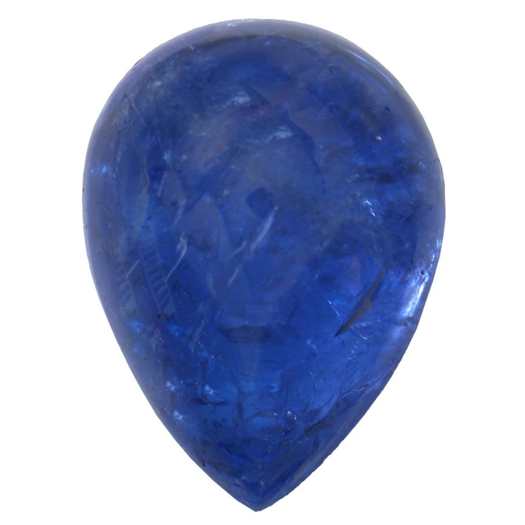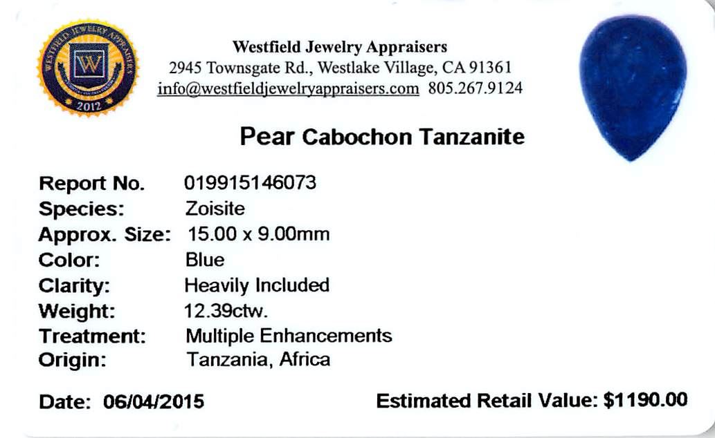 One pear cabochon cut natural tanzanite, measuring 16.00 x 11.00 x 8.00mm, exact weight 12.39ct., clarity is heavily included, type I, dark, moderately strong, blue color, (GIA B 7/4), cut is good. Transmitting light somewhat diffusely, transparent to translucent. Naturally occurring internal & external characteristics are present. Indications of heat treatment. Westfield Appraised at $1,190.00.