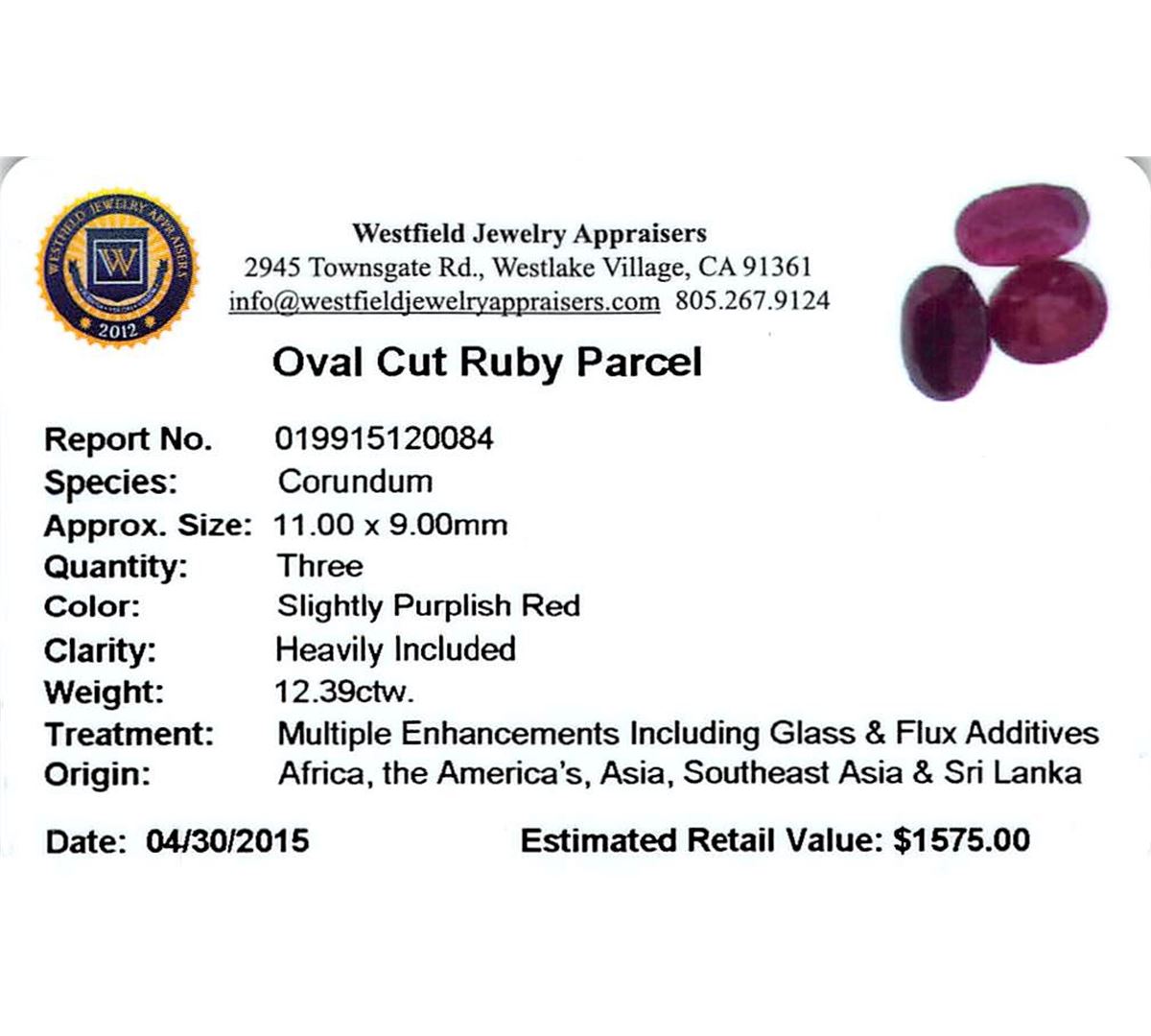 Three oval mixed cut natural rubies exact total weight 12.39ct., clarity is heavily included, type II, dark, very slightly brownish, slightly purplish red color, (GIA slpR 7/3), cut is good. Westfield Appraised at $1,575.00.