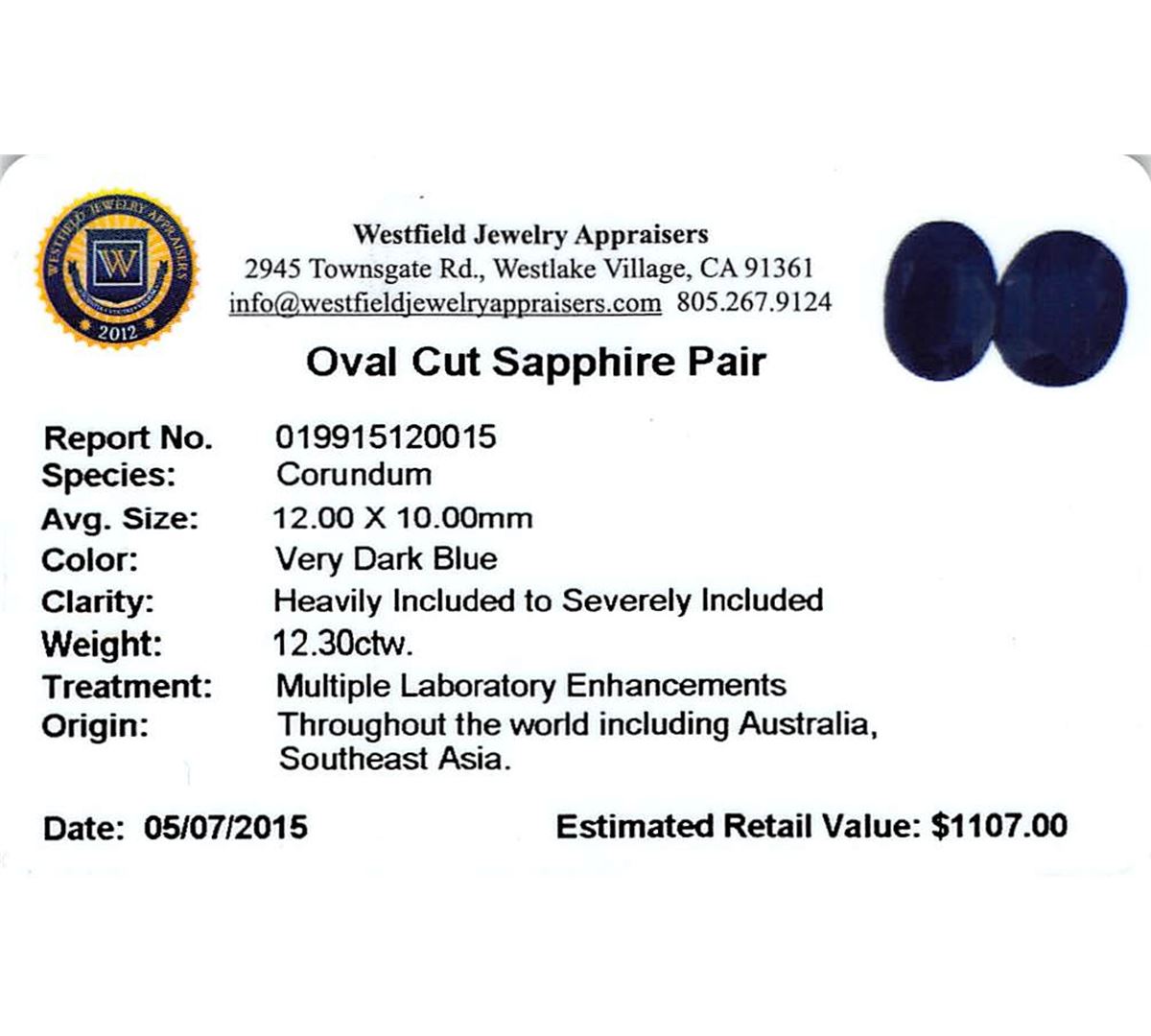 Two oval cut sapphires, measuring 12.00 x 10.00mm, approximate total weight of 12.30ct., clarity is heavily included to severely included, very dark blue color. Indications of multiple laboratory enhancements. Westfield Appraised at $1,107.00.