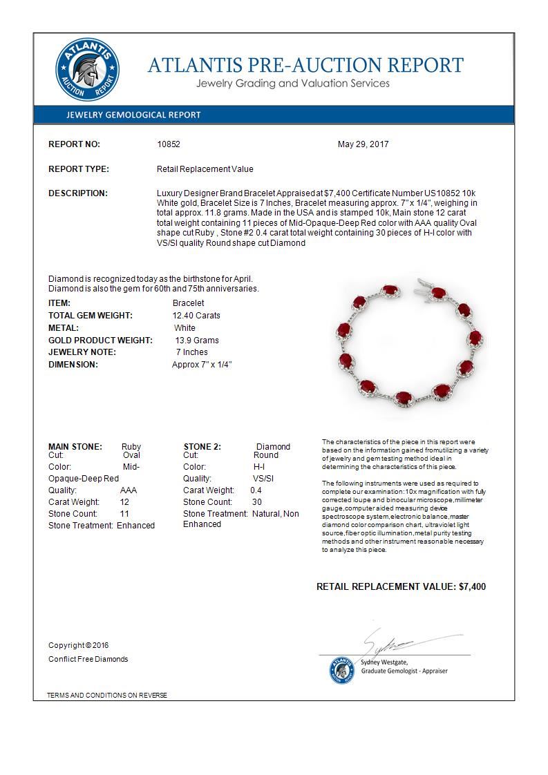 12.40 CTW Ruby & Diamond Bracelet 10K White Gold ---- Luxury Designer Brand Bracelet Appraised Retail Price at $7,400 ---- SKU Number US10852 10k White gold Bracelet Size is 7 Inches, Bracelet measuring approx. 7" x 1/4", weighing in total approx. 11.8 grams. Made in the USA and is stamped 10k, Main stone 12 carat total weight containing 11 pieces of Mid-Opaque-Deep Red color with AAA quality Oval shape cut Ruby , Stone #2 0.4 carat total weight containing 30 pieces of H-I color with VS/SI quality Round shape cut