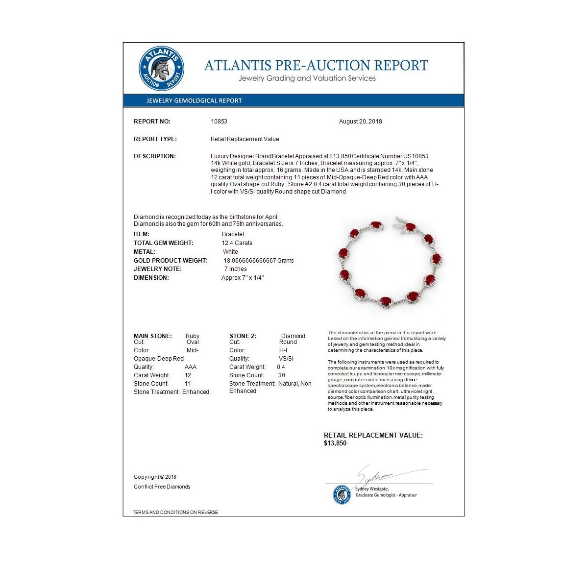 REF-180A2X -10853 ---- 12.40 CTW Ruby & Diamond Bracelet 14K White Gold ---- Luxury Designer Brand Bracelet Appraised at $13,850 Certificate Number US10853 14k White gold, Bracelet Size is 7 Inches, Bracelet measuring approx. 7" x 1/4", weighing in total approx. 16 grams. Made in the USA and is stamped 14k, Main stone 12 carat total weight containing 11 pieces of Mid-Opaque-Deep Red color with AAA quality Oval shape cut Ruby , Stone #2 0.4 carat total weight containing 30 pieces of H-I color with VS/SI quality Round shape cut Diamond