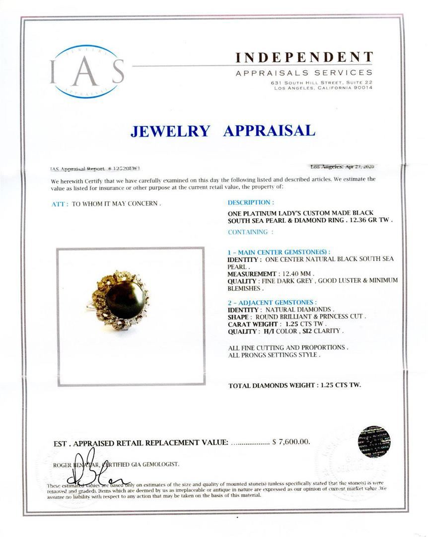 DESCRIPTION : ONE PLATINUM LADY'S CUSTOM MADE BLACK SOUTH SEA PEARL & DIAMOND RING. 12.36 GR TW. CONTAINING : 1 - MAIN CENTER GEMSTONE(S) : IDENTITY : ONE CENTER NATURAL BLACK SOUTH SEA PEARL. MEASUREMEMT : 12.40 MM. QUALITY : FINE DARK GREY, GOOD LUSTER & MINIMUM BLEMISHES. 2 - ADJACENT GEMSTONES : IDENTITY : NATURAL DIAMONDS. SHAPE : ROUND BRILLIANT & PRINCESS CUT. CARAT WEIGHT : 1.25 CTW TW. QUALITY : H/I COLOR, SI2 CLARITY. ALL FINE CUTTING AND PROPORTIONS. ALL PRONGS SETTINGS STYLE. TOTAL DIAMONDS WEIGHT : 1.25 CTW TW.