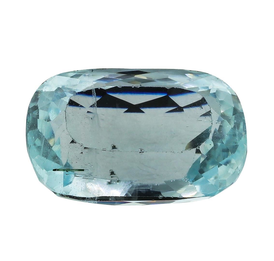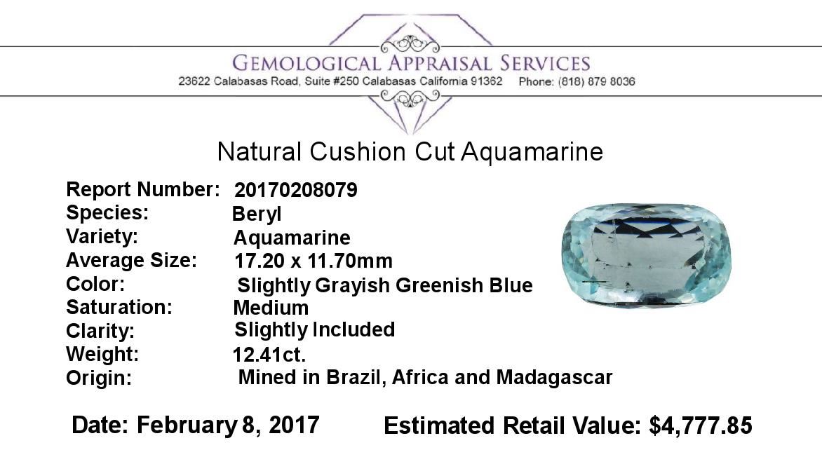 One natural cushion cut aquamarine with an exact weight of 12.41ct., clarity is slightly included, slightly grayish greenish blue, medium. Gemological Appraisals Services estimates the retail value at $4777.85 GAS Appraised.