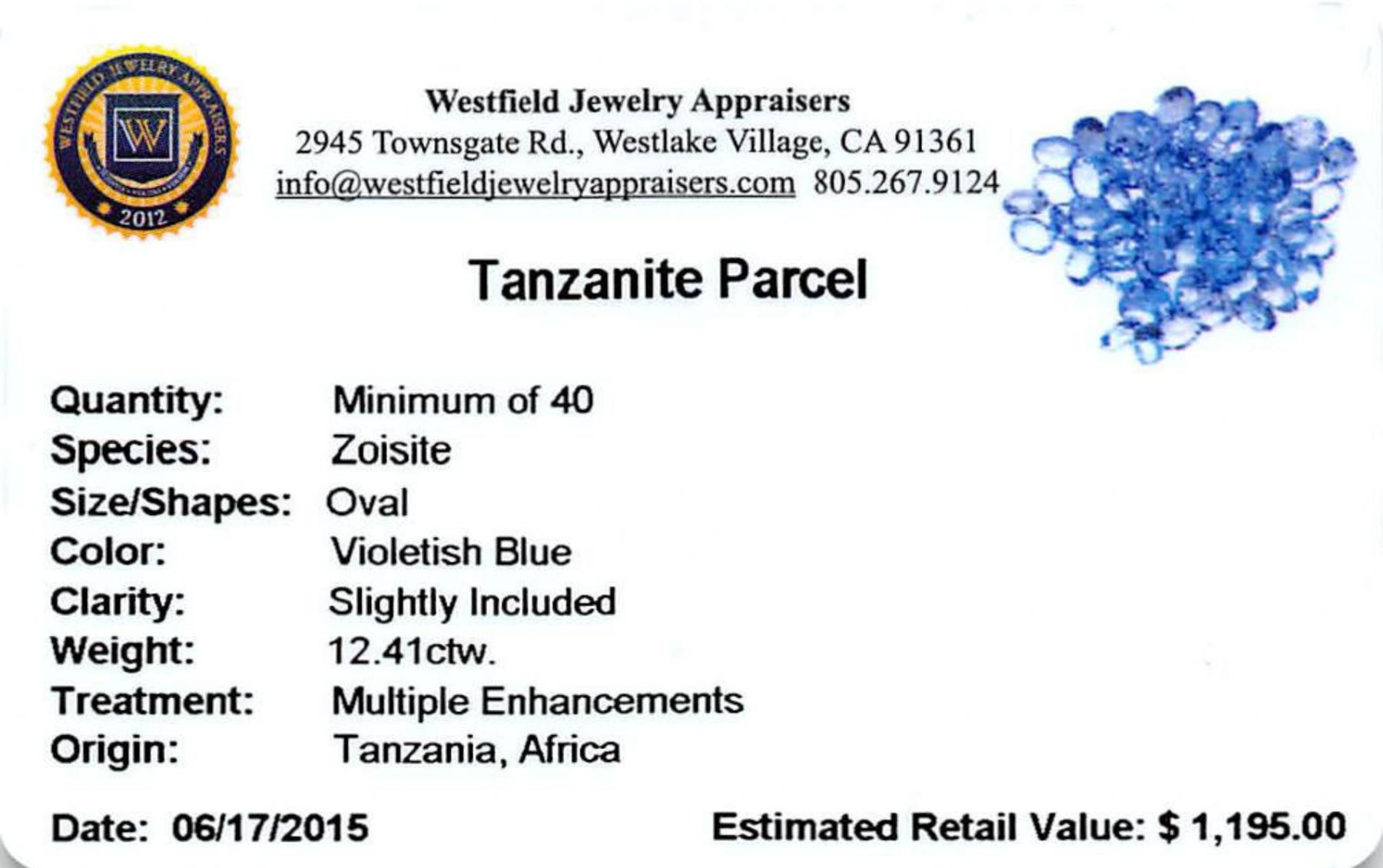 Forty oval mixed cut natural tanzanites exact total weight 12.41ct., clarity is slightly included, type I, medium dark, very slightly grayish, violetish blue color, (GIA vB 6/3), cut is good. Measurements & the color grade are an average for the group, Color grade is an average for the group, Transmitting light with no distortion, transparent, Indications of laboratory high temperature heat treatment. Westfield Appraised.