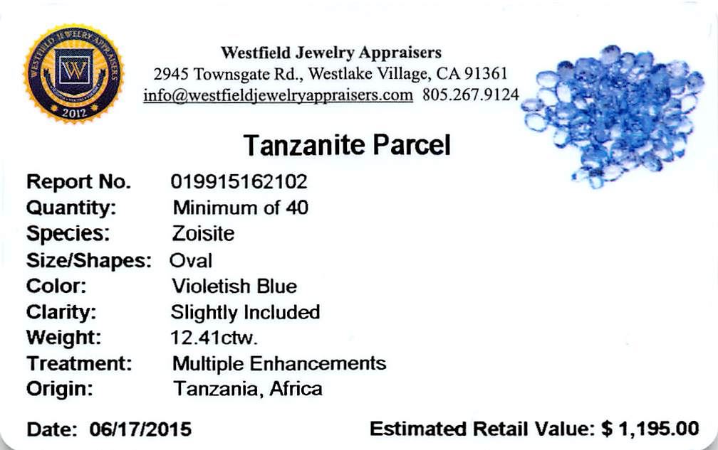 Forty oval mixed cut natural tanzanites exact total weight 12.41ct., clarity is slightly included, type I, medium dark, very slightly grayish, violetish blue color, (GIA vB 6/3), cut is good. Measurements & the color grade are an average for the group, Color grade is an average for the group, Transmitting light with no distortion, transparent, Indications of laboratory high temperature heat treatment. Westfield Appraised at $1,195.00.