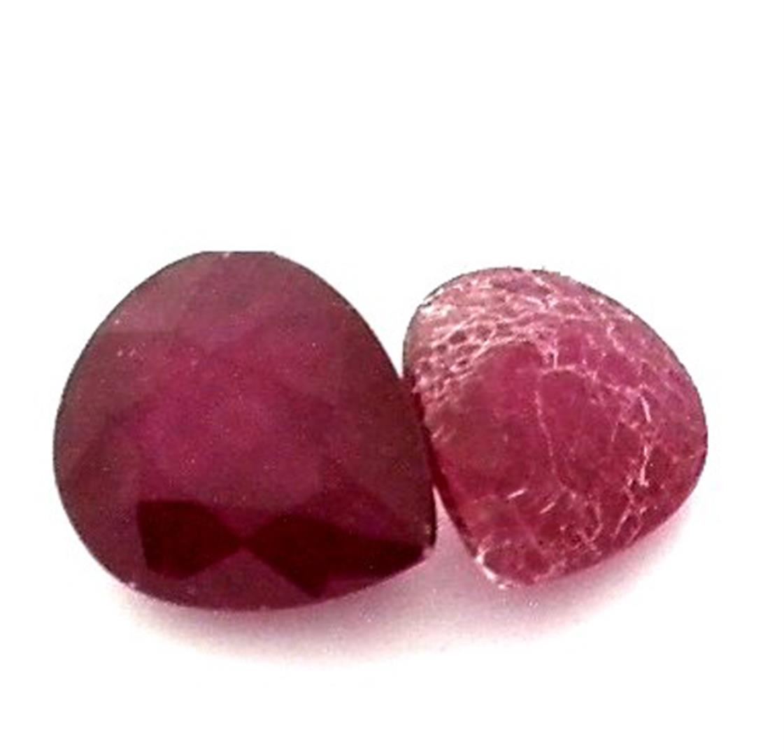 Two pear mixed cut natural s, measuring 11.00 x 10.00 x 4.80mm, exact total weight 12.42ct., clarity is heavily included, dark, very slightly brownish, red color, (GIA R 7/3), cut is good. Measurements are an average for the pair. Transmitting light somewhat diffusely, transparent to translucent. Naturally occurring internal & external characteristics are present. Indications of laboratory high temperature heat treatment, with glass & flux additives. Ruby has a low tolerance to rhodium plating, repolishing the surface, & ultrasonic cleaning. Westfield Appraised at $1,670.00.