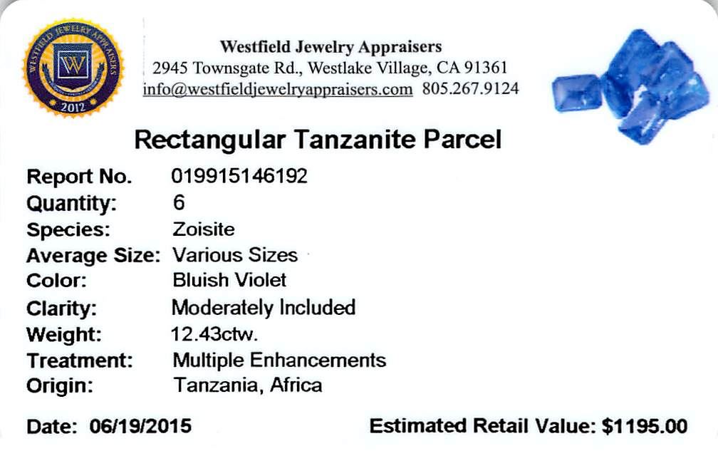 Six rectangular step cut natural tanzanites exact total weight 12.43ct., clarity is moderately included, type I, medium dark, very slightly grayish, bluish violet color, (GIA bV 6/3), cut is good. Transmitting light with a minimum of distortion, transparent. Naturally occurring internal & external characteristics are present. Color grade is an average for the group. Tanzanite is a very rare gemstone that is only found in the country of Tanzania. Originally discovered in 1967. Tiffany & Company, named the stone Tanzanite. It is found in the Usumburu Mountains that border the Umba Valley of northern Tanzania. Tanzanite occurs in gray, brown, violet, blue, reddish-purple, & green. The gem is interesting because of its exceptional pleochroism. Rotated in different directions a tanzanite will exhibit multiple changes of color. Tanzanite has a low tolerance to ultrasonic cleaning, and should not be cleaned using this method. Westfield Appraised at $1,195.00.