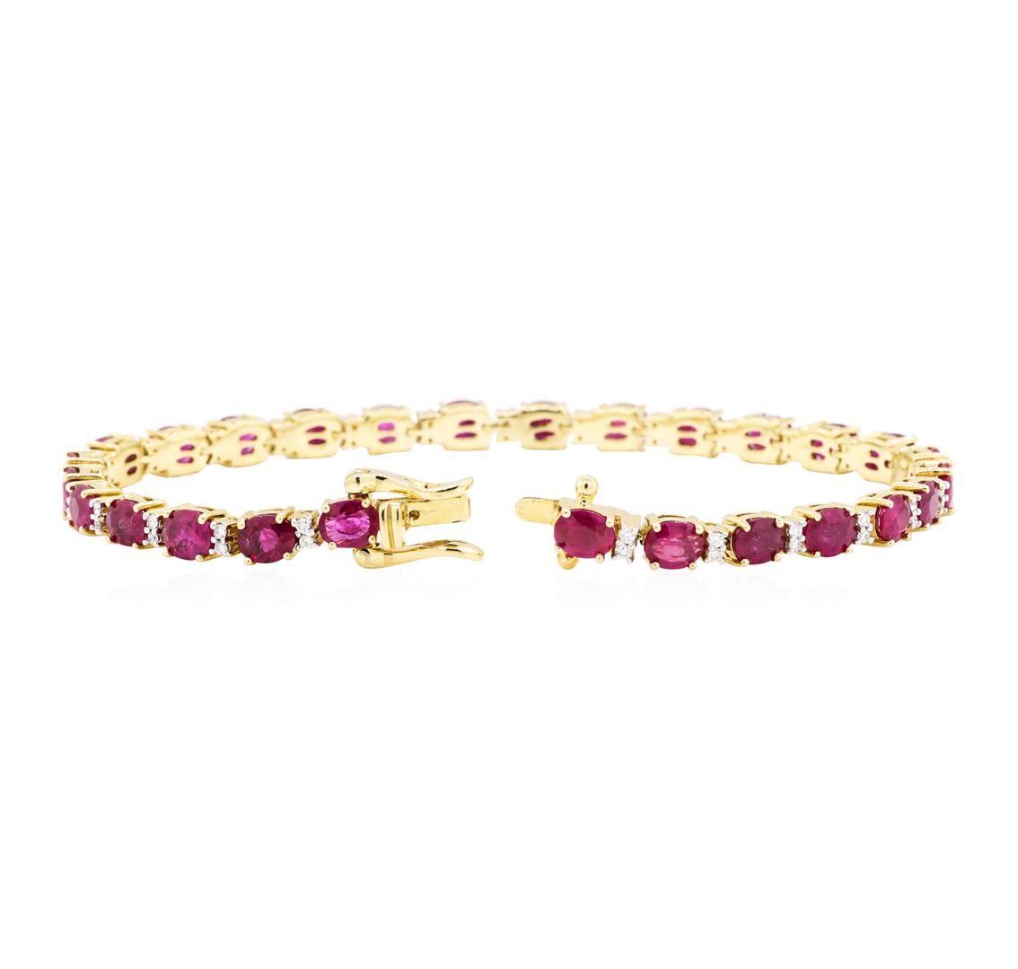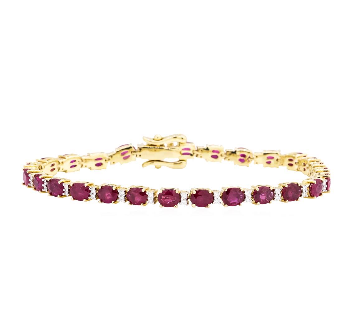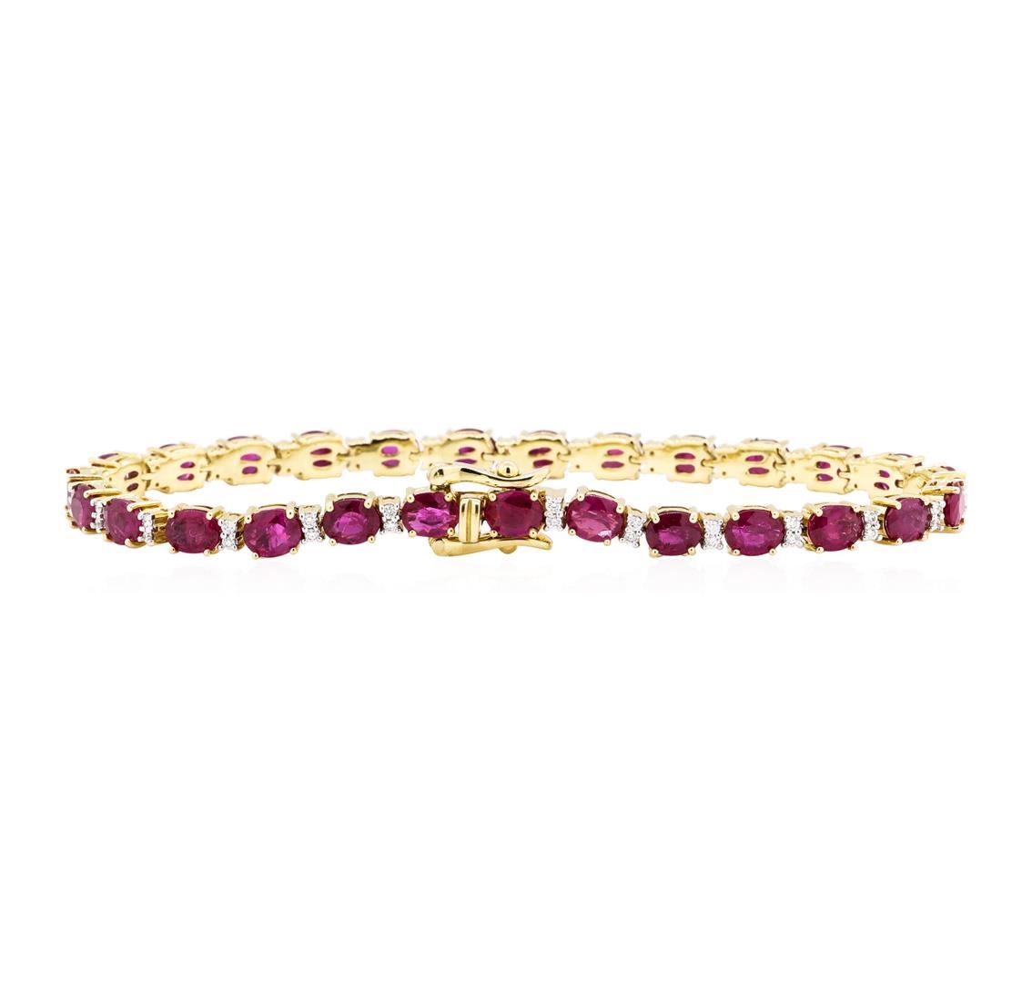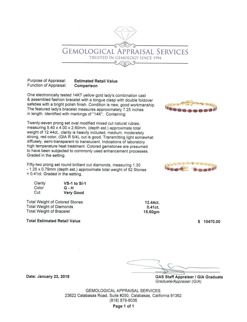One electronically tested 14KT yellow gold lady's combination cast & assembled fashion bracelet with a tongue clasp with double foldover safeties with a bright polish finish. The featured lady's bracelet measures approximately 7.25 inches in length. Identified with markings of '14K'. Condition is new, good workmanship. Containing: Twenty-seven prong set oval modified mixed cut natural rubies, measuring 5.40 x 4.00 x 2.60mm, (depth est.) approximate total weight of 12.44ct., clarity is heavily included, medium, moderately strong, red color, (GIA R 5/4), cut is good. Transmitting light somewhat diffusely, semi-transparent to translucent. Indications of laboratory high temperature heat treatment. Colored gemstones are presumed to have been subjected to commonly used enhancement processes. Graded in the setting. Fifty-Two prong set round brilliant cut diamonds, measuring 1.30 - 1.25 x 0.79mm (depth est.) approximate total weight of 52 Stones = 0.41ct. Graded in the setting. Color G - H Clarity VS-1 to SI-1 Cut Very Good. Total Weight of Colored Stones 12.44ct.. Total Weight of Diamonds 0.41ct.. Total Weight of Bracelet 15.60gm GAS Appraised at $10470.00. GAS Appraised at $10,470.00.