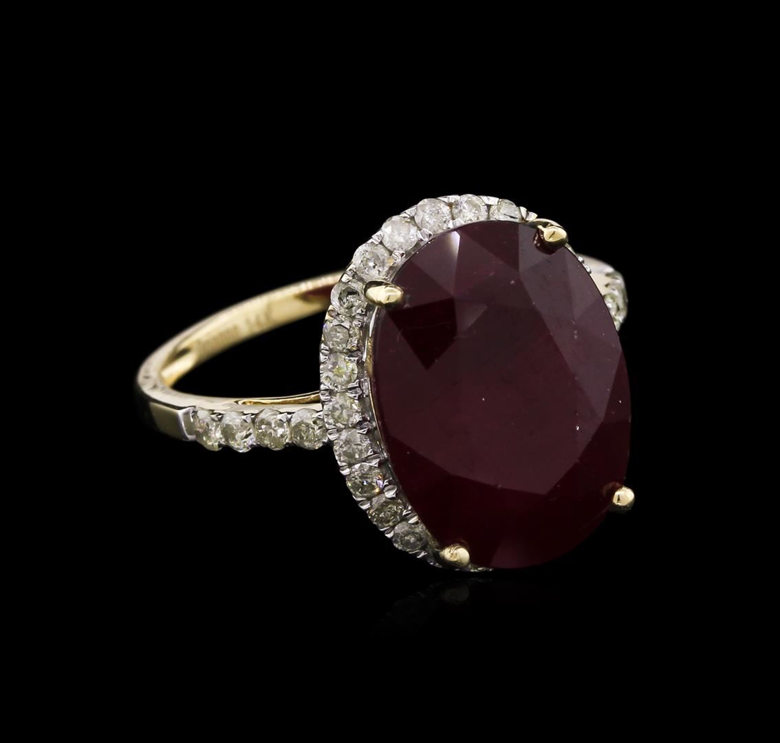 Fourteen karat (14K) yellow gold ruby and diamond ring. An oval cut ruby corundum gemstone is prong mounted in the center of the ring. Round brilliant cut diamonds accent the ring around the center gemstone and on both sides. The ring is cast stamped "14K" and has a gross weight of 4.9 Grams. Diamond(s): Shape: Round Brilliant Cut. Weight: 0.66 carat. Average Clarity: I1-I2. Average Color: H-J. Symmetry: Very Good. Polish: Very Good. Gemstone(s): GemStone: Ruby Corundum. Nature: Natural. Shape: Oval, Faceted. Quantity: 1, Mounted. Weight 12.44 carat. Dimensions: Length-14.95 mm. ; Width- 11.25 mm. Bulge: Visible. Clarity: I1, Type 3. Color: Red (5/5). Symmetry: Very Good. Color Intensity: Medium. Transparency: Transparent. Tone: Dark. Enhancements: Indications of high temperature heat treatment, with glass and flux additives. Metal(s): Metal: Gold, Stamped. Purity: 14K. Color: Yellow. Condition: Excellent. Finish: High polish. GGA Appraised.