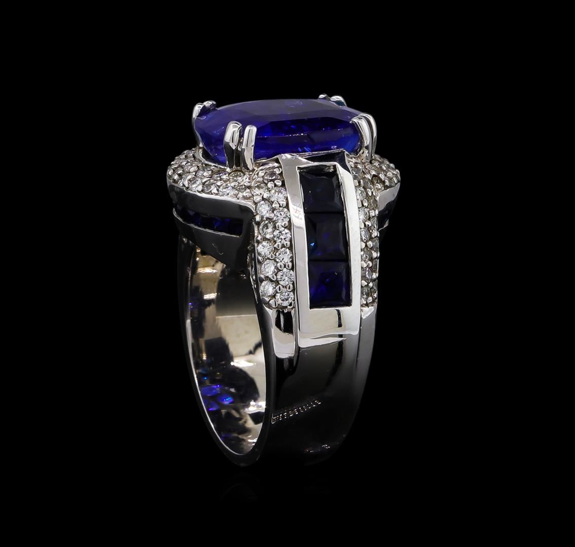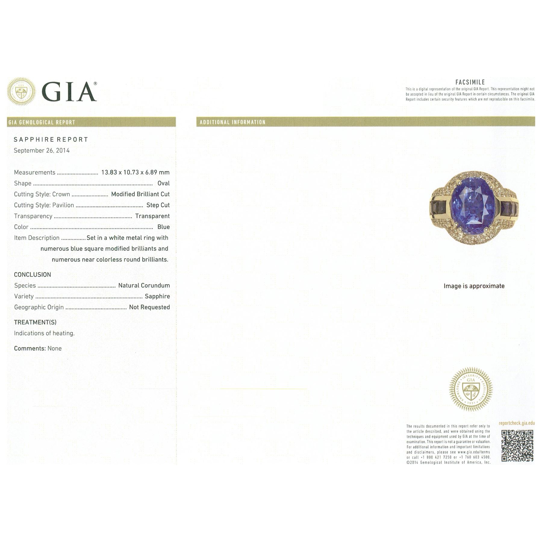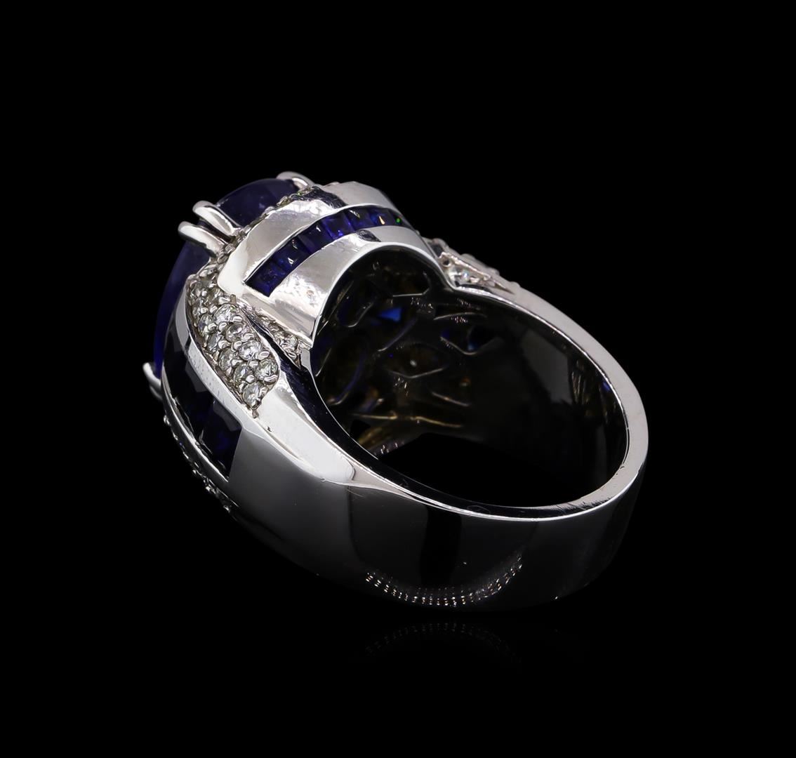 One electronically tested 14KT white gold lady's cast fashion ring with a wide band with a halo with a bright polish finish. The featured lady's ring has a shank measuring 6.06 millimeters wide. Identified with markings of '14K'. Condition is new, good workmanship. Containing: One prong set oval modified mixed cut natural blue sapphire, measuring 13.83 x 10.73 x 6.89mm, (depth est.) 15%. bulge factor, approximate weight of 10.04ct., clarity is moderately included, medium, moderately strong, blue color, (GIA B 5/4), cut is very good. Transmitting light somewhat diffusely, transparent to translucent. Indications of laboratory high temperature heat treatment. Graded in the GIA Laboratory, Report #1166617801. Six channel set square modified brilliant cut natural blue sapphires, measuring 3.90 x 3.50 x 2.41mm, (depth est.) approximate total weight of 1.95ct., clarity is eye clean, dark, moderately strong, blue color, (GIA B 7/4), cut is very good. Transmitting light with no distortion, transparent. Colored gemstones are presumed to have been subjected to commonly used enhancement processes. Graded in the setting. Seventeen channel set square modified brilliant cut natural blue sapphires, measuring 1.70 x 1.40 x 1.01mm, (depth est.) approximate total weight of 0.46ct., clarity is eye clean, dark, moderately strong, blue color, (GIA B 7/4), cut is very good. Transmitting light with no distortion, transparent. Colored gemstones are presumed to have been subjected to commonly used enhancement processes. Graded in the setting. Ninety prong set round brilliant cut diamonds, measuring 1.40 - 1.35 x 0.86mm (depth est.) approximate total weight of 90 Stones = 0.92ct. Graded in the setting. Color H - I Clarity SI-1 to I-1 Cut Good. Total Weight of Colored Stones 12.45ct.. Total Weight of Diamonds 0.92ct.. Total Weight of Ring 17.60gm GAS Appraised at $50,090.00.