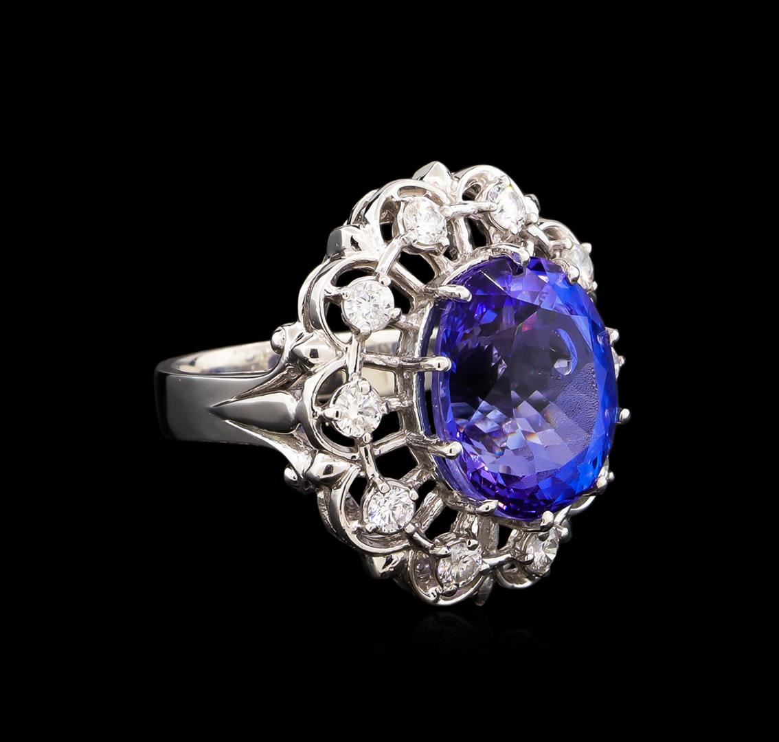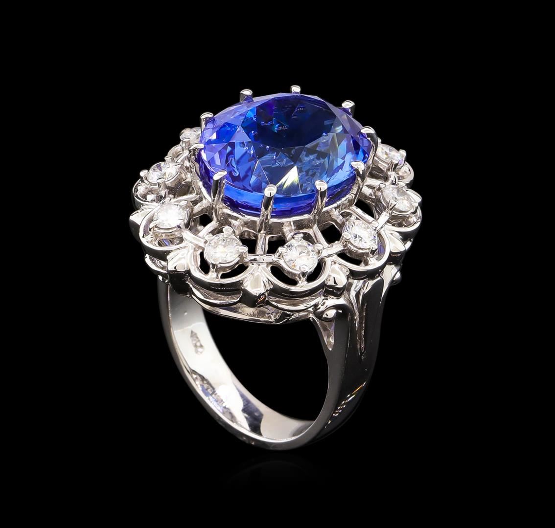 One electronically tested 14KT white gold lady's cast fashion ring with a basket halo with a bright polish finish. The featured lady's ring has a shank measuring 4.07 millimeters wide. Identified with markings of "K14". Condition is new, good workmanship. Containing: One prong set oval modified brilliant cut natural tanzanite, measuring 14.62 x 12.66 x 9.34mm, 3%. bulge factor, approximate weight of 12.45ct., clarity is eye clean, type I, medium dark, moderately strong, violetish blue color, (GIA vB 6/4), cut is very good. Transmitting light with no distortion, transparent. Colored gemstones are presumed to have been subjected to commonly used enhancement processes. Graded in the setting. Ten prong set round brilliant cut diamonds, measuring 2.80 - 2.70 x 1.68mm (depth est.) approximate total weight of 10 Stones = 0.77ct. Graded in the setting. Clarity: SI-1 to I-1. Color: G - I. Cut Good. Total Weight of Colored Stones 12.45ct. Total Weight of Diamonds 0.77ct. Total Weight of Ring 11.90gm. GAS Appraised at $25,530.00.