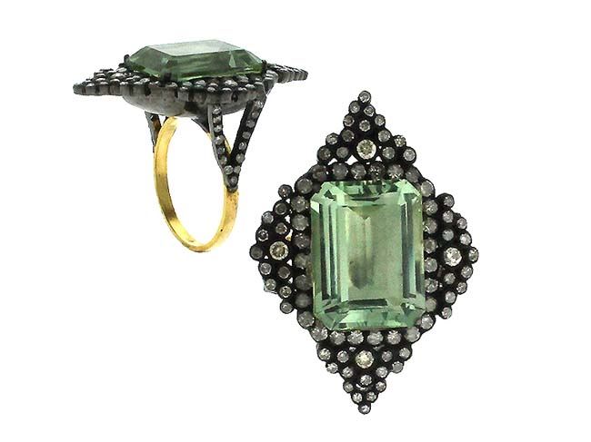 GREEN AMETHYST AND DIAMOND RING/Diamond Count 1:/Diamond Total Carat :1.93/Diamond Color & Clarity:J-L/I1-I2 Single Cut /Diamond Count 2:/Diamond 2 CTW:/Diamond Count 3:/Gemstone Count 1:1 pc/Gemstone CTW:10.53/Gemstone Dimension:/Gemstone Shape:Emerald Cut-Green Amethyst /Gemstone Count 2:/Gemstone CTW:/Gemstone Shape:/Ring Dimension:/Metal Type 1:18kYellow Gold :Gram Weight:1.9/Metal Type 2:over0.925Sterling Silver / Weight Gram:5.2/Gross Weight :9.59/Ring Size:7