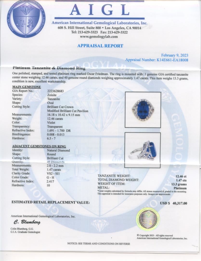 One polished, stamped, and tested platinum ring marked Oscar Friedman. The ring is mounted with: 1 genuine GIA certified tanzanite center stone weighing 12.46 carats, and 40 genuine round diamonds weighing approximately 1.47 carats. This item weighs 13.3 grams, condition is new, excellent workmanship. #MAIN GEMSTONE# GIA Report No.: 2223628683; Species: Zoisite; Variety: Tanzanite; Shape: Oval; Cutting Style: Brilliant Cut Crown, Modified Brilliant Cut Pavilion; Measurements: 16.18 x 10.42 x 9.15mm; Weight: 12.46 carats; Color: Violet; Transparency: Transparent; Refractive Index: 1.691 - 1.700 DR; Birefringence: 0.008 - 0.013; Hardness: 6.5 - 7 #ADJACENT GEMSTONES ON RING# Identity: Natural Diamond; Shape: Round; Cutting Style: Brilliant Cut; Quantity: 40 Diamonds; Measurements: 2.0 - 2.2mm; Total Weight: 1.47 carats; Clarity Grade: VS2-SI1; Color Grade: G-H; Refractive Index: 2.417; Hardness: 10; TANZANITE WEIGHT: 12.46 ct; TOTAL DIAMOND WEIGHT: 1.47 cts.; WEIGHT OF ITEM: 13.3 grams; METAL: Platinum #Size: 6 3/4