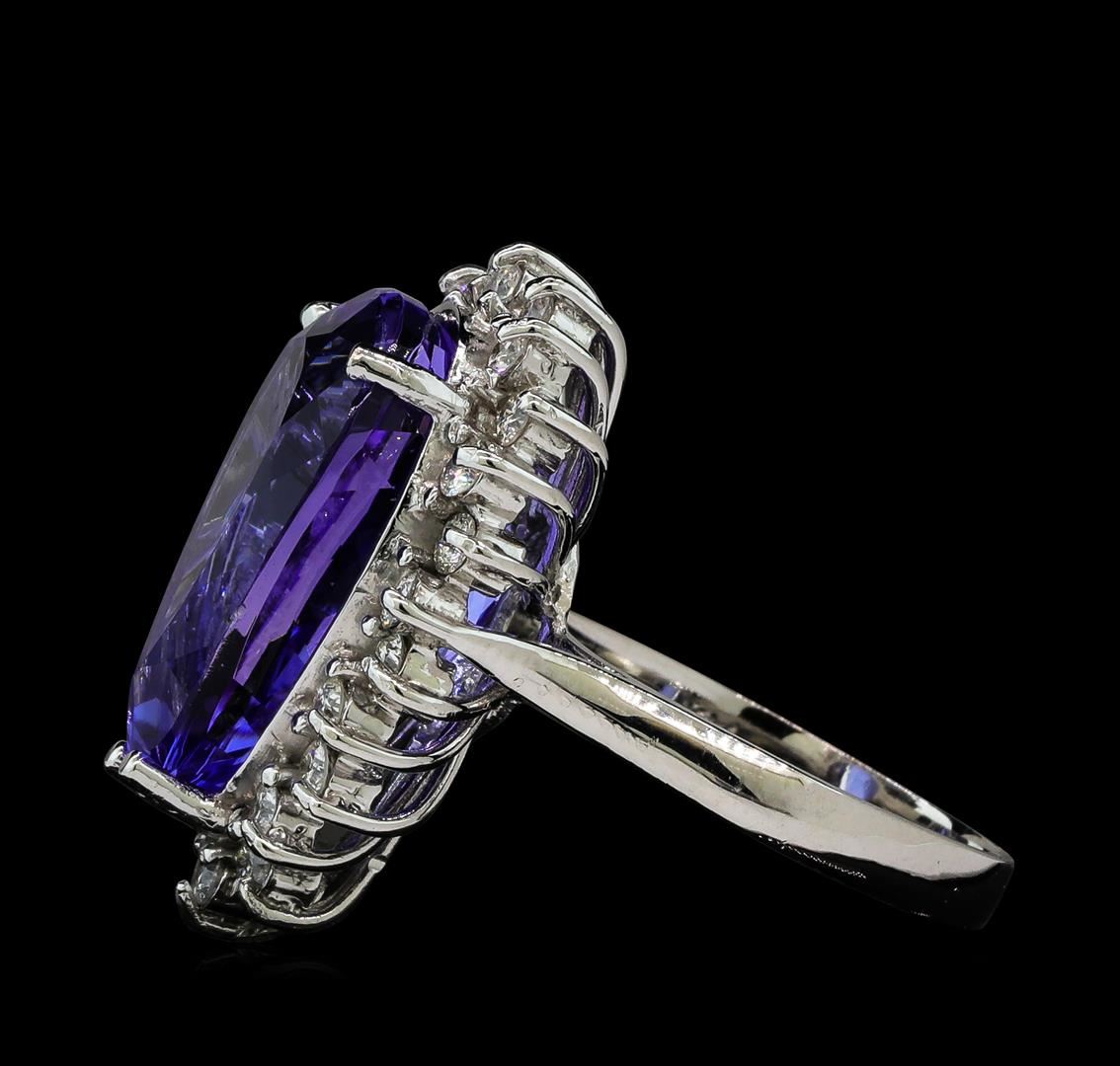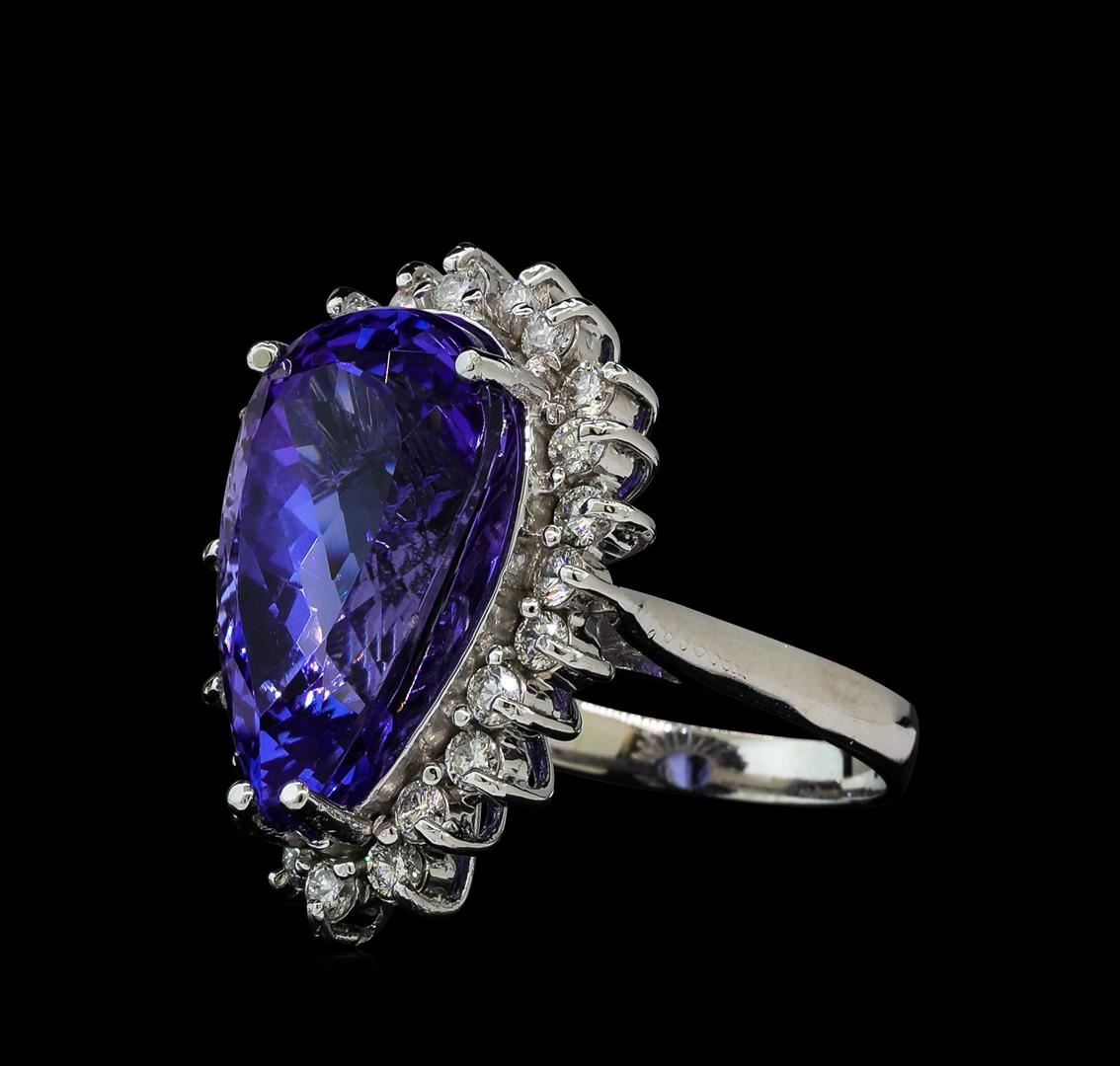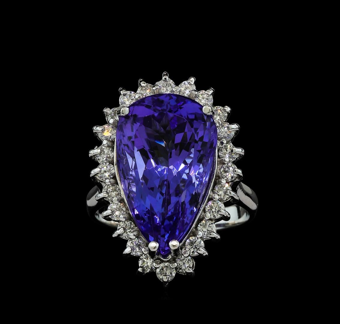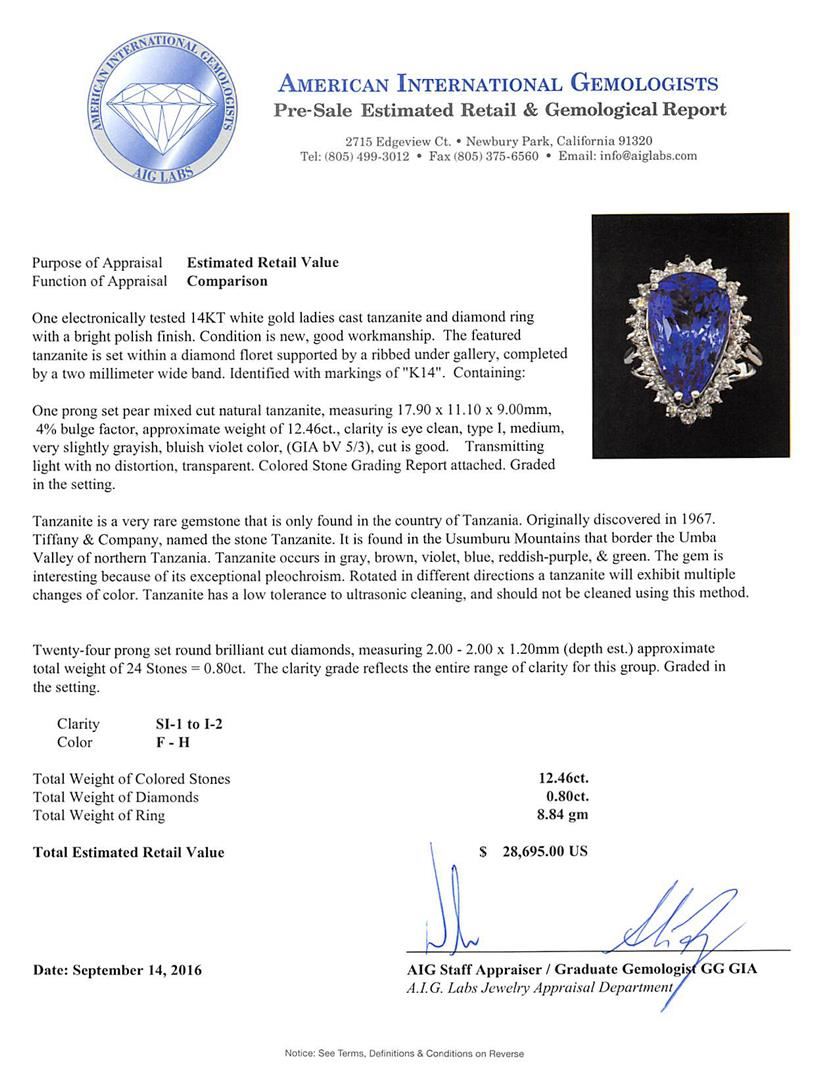 One electronically tested 14KT white gold ladies cast tanzanite and diamond ring with a bright polish finish. The featured tanzanite is set within a diamond floret supported by a ribbed under gallery, completed by a two millimeter wide band. Identified with markings of 'K14'. Condition is new, good workmanship. Containing: One prong set pear mixed cut natural tanzanite, measuring 17.90 x 11.10 x 9.00mm, 4%. bulge factor, approximate weight of 12.46ct., clarity is eye clean, type I, medium, very slightly grayish, bluish violet color, (GIA bV 5/3), cut is good. Transmitting light with no distortion, transparent. Colored Stone Grading Report attached. Graded in the setting. Tanzanite is a very rare gemstone that is only found in the country of Tanzania. Originally discovered in 1967. Tiffany & Company, named the stone Tanzanite. It is found in the Usumburu Mountains that border the Umba Valley of northern Tanzania. Tanzanite occurs in gray, brown, violet, blue, reddish-purple, & green. The gem is interesting because of its exceptional pleochroism. Rotated in different directions a tanzanite will exhibit multiple changes of color. Tanzanite has a low tolerance to ultrasonic cleaning, and should not be cleaned using this method. Twenty-Four prong set round brilliant cut diamonds, measuring 2.00 - 2.00 x 1.20mm (depth est.) approximate total weight of 24 Stones = 0.80ct. The clarity grade reflects the entire range of clarity for this group. Graded in the setting. Clarity SI-1 to I-2. Color: F - H. Total Weight of Colored Stones 12.46ct.. Total Weight of Diamonds 0.80ct.. Total Weight of Ring 8.84gm. AIG Appraised at $28,695.00.