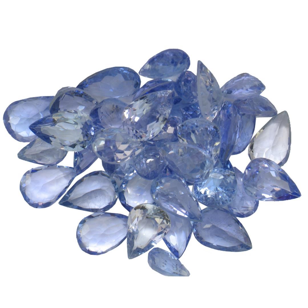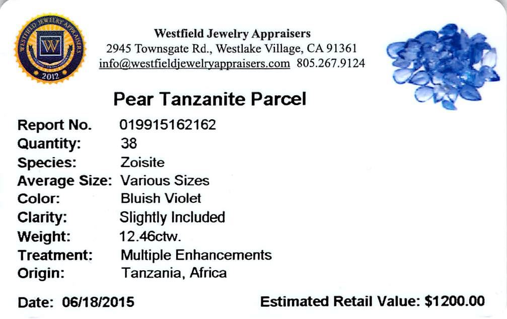 Thirty-eight pear mixed cut natural tanzanites exact total weight 12.46ct., clarity is slightly included, type I, medium dark, very slightly grayish, bluish violet color, (GIA bV 6/3), cut is good. Transmitting light with a minimum of distortion, transparent. Naturally occurring internal & external characteristics are present. Color grade is an average for the group. Tanzanite is a very rare gemstone that is only found in the country of Tanzania. Originally discovered in 1967. Tiffany & Company, named the stone Tanzanite. It is found in the Usumburu Mountains that border the Umba Valley of northern Tanzania. Tanzanite occurs in gray, brown, violet, blue, reddish-purple, & green. The gem is interesting because of its exceptional pleochroism. Rotated in different directions a tanzanite will exhibit multiple changes of color. Tanzanite has a low tolerance to ultrasonic cleaning, and should not be cleaned using this method. Westfield Appraised at $1,200.00.
