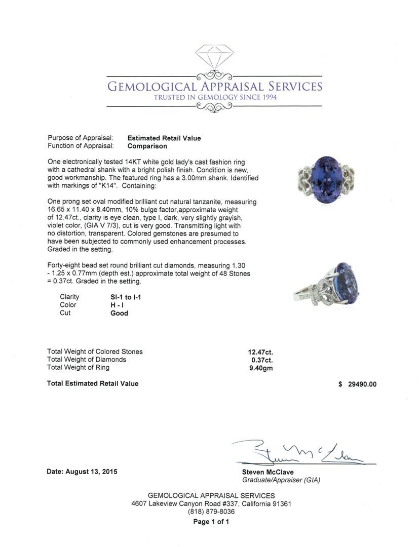 One electronically tested 14KT white gold lady's cast fashion ring with a cathedral shank with a bright polish finish. The featured ring has a 3.00mm shank. Identified with markings of "K14". Condition is new, good workmanship. Containing: One prong set oval modified brilliant cut natural tanzanite, measuring 16.65 x 11.40 x 8.40mm, 10% bulge factor, approximate weight of 12.47ct., clarity is eye clean, type I, dark, very slightly grayish, violet color, (GIA V 7/3), cut is very good. Transmitting light with no distortion, transparent. Colored gemstones are presumed to have been subjected to commonly used enhancement processes. Graded in the setting. Forty-Eight bead set round brilliant cut diamonds, measuring 1.30 - 1.25 x 0.77mm (depth est.) approximate total weight of 48 Stones = 0.37ct. Graded in the setting. Clarity: SI-1 to I-1. Color: H - I. Cut Good. Total Weight of Colored Stones 12.47ct. Total Weight of Diamonds 0.37ct. Total Weight of Ring 9.40gm. GAS Appraised at $29,490.00.