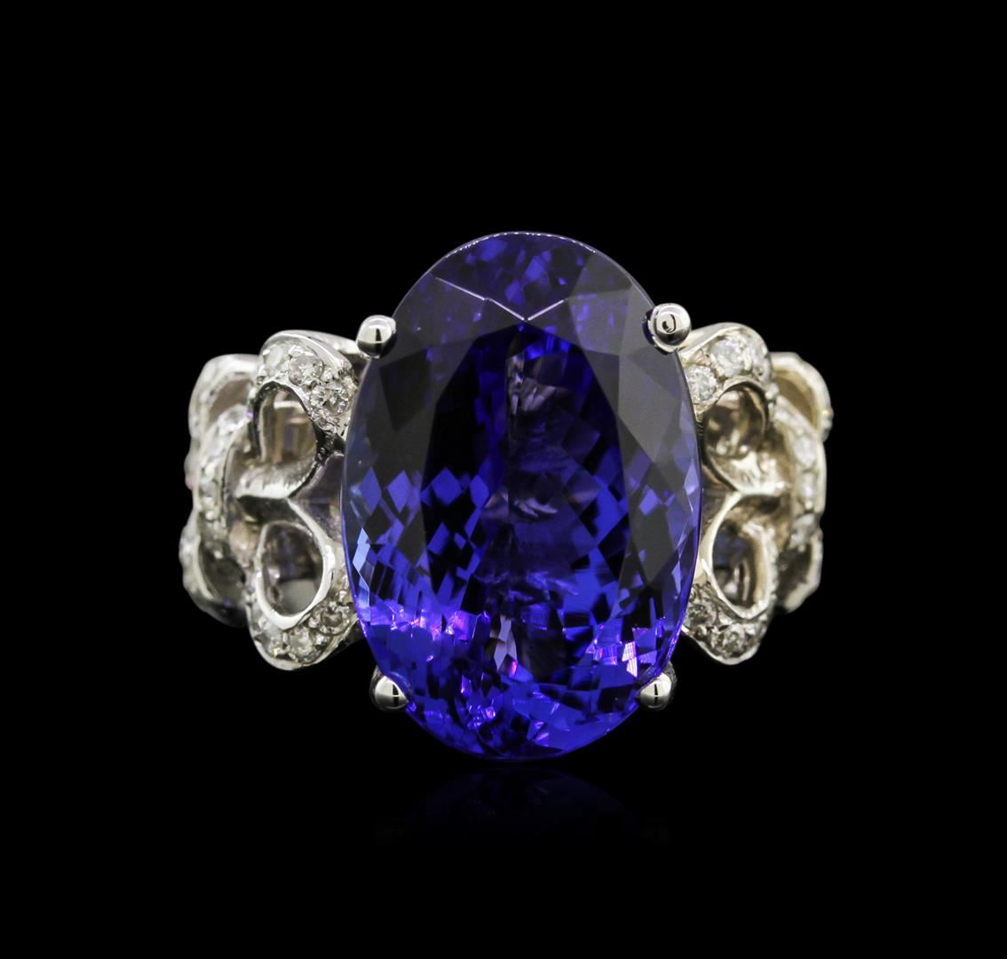 One electronically tested 14KT white gold lady's cast fashion ring with a cathedral shank with a bright polish finish. The featured ring has a 3.00mm shank. Identified with markings of "K14". Condition is new, good workmanship. Containing: One prong set oval modified brilliant cut natural tanzanite, measuring 16.65 x 11.40 x 8.40mm, 10% bulge factor, approximate weight of 12.47ct., clarity is eye clean, type I, dark, very slightly grayish, violet color, (GIA V 7/3), cut is very good. Transmitting light with no distortion, transparent. Colored gemstones are presumed to have been subjected to commonly used enhancement processes. Graded in the setting. Forty-Eight bead set round brilliant cut diamonds, measuring 1.30 - 1.25 x 0.77mm (depth est.) approximate total weight of 48 Stones = 0.37ct. Graded in the setting. Clarity: SI-1 to I-1. Color: H - I. Cut Good. Total Weight of Colored Stones 12.47ct. Total Weight of Diamonds 0.37ct. Total Weight of Ring 9.40gm. GAS Appraised at $29,490.00.